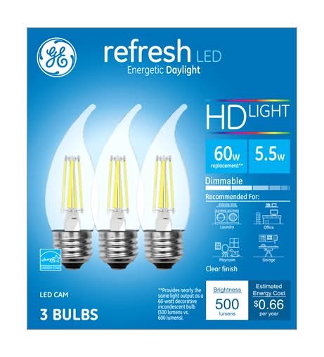 Refresh HD Daylight LED light bulbs feature a clear finish and bent tip design, making them visually appealing for indoor chandeliers, sconces, and fixtures where the bulb is visible. These dimmable bulbs are designed for use in active spaces, including playrooms, home offices, laundry rooms, basements, and garages. They emit a cool, bluish-white light, intended to create an energetic atmosphere with enhanced color contrast and boldness. Suitable for damp locations, these light bulbs provide instant full brightness and are free of Mercury, crafted to replace CFL and incandescent bulbs effectively.