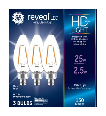 Illuminate your space with GE Reveal HD+ LED light bulbs, specifically designed for decorative use in visible fixtures like chandeliers and sconces. These clear, blunt tip bulbs are engineered to enhance colors and whiten whites for exceptional clarity, making them ideal for areas where clear, vibrant illumination is key, such as kitchens, bathrooms, and craft spaces. Their advanced technology not only provides pure, clean light but also allows for dimming to suit your mood or ambiance needs. These bulbs are suitable for indoor use, can be used in damp locations, and are designed to replace CFL and incandescent bulbs without the use of mercury, offering instant full brightness when turned on. Ideal for enhancing the aesthetic and functional quality of your lighting.