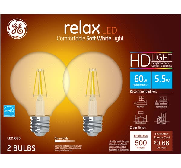 Relax HD LED 60w Eq Clear Globe Soft White Dimmable Light Bulb 2-pack is designed for energy efficiency and enhances the appearance of colors with its warm, soft white light. Ideal for creating comfortable moments and cozy atmospheres, it is suitable for bedrooms, family rooms, and dining rooms. This bulb can be installed in table lamps, sconces, and open fixtures, and features a clear globe design, allowing for pleasant illumination with enhanced contrast. It is also dimmable, providing versatile lighting options.