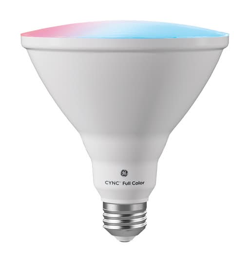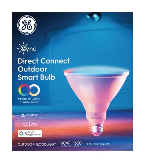 Cync Full Color Direct Connect Smart PAR38 Outdoor Flood Light Nondimmable Light Bulb is an outdoor flood light that can display a full spectrum of colors and a tunable white setting. It features remote control capabilities and is compatible with voice control systems. This smart bulb allows for scheduling, enabling users to automate their home lighting for added security, or to enhance the ambiance for various occasions such as parties and holidays. It is specifically designed to augment outdoor landscaping and architecture with customizable lighting options. Color: Full color