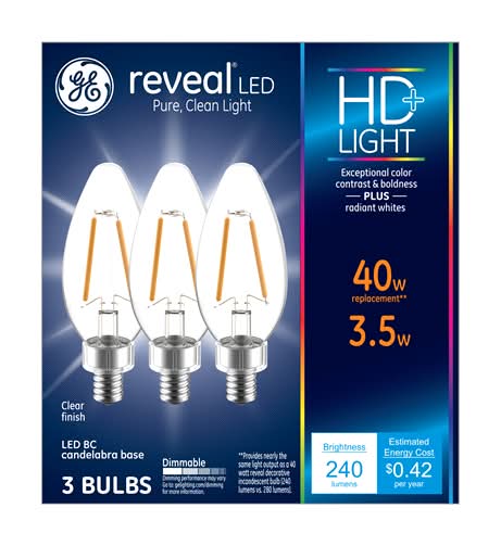 Reveal HD+ LED light bulbs feature a clear finish and a decorative blunt tip. These dimmable bulbs are designed for indoor use, including damp locations, and are perfect for areas where clarity is crucial such as kitchens, bathrooms, and craft or hobby spaces. They use advanced technology to enhance colors and whiten whites, ensuring exceptional color quality and clarity. The bulbs fit a candelabra base and are meant to replace CFL and incandescent light bulbs. They emit instant full brightness and are free of mercury.