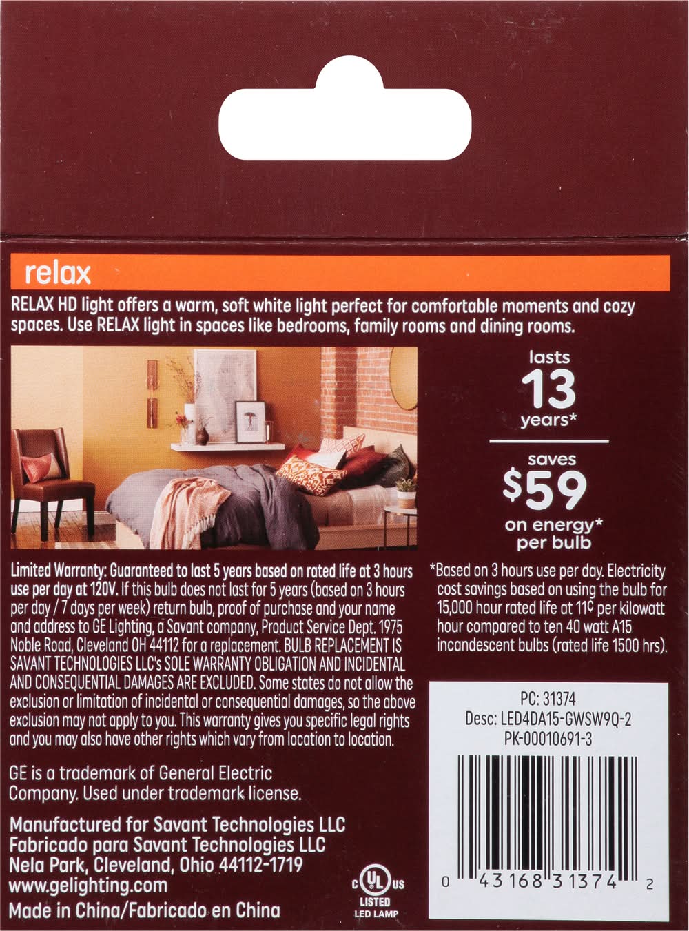 Light Bulbs, LED, Soft White, 4 Watts Savant Technologies LLC, Nela Park,Cleveland,OH