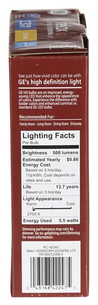 Relax Hd Led 60w Eq Clear Decorative Medium Base Bent Tip Dimmable Light Bulb 3-pack features LED technology designed to save energy compared to traditional bulbs. The light quality is warm and soft white, enhancing color appearance and contrast, making colors appear bolder. These bulbs are dimmable, allowing for adjustable lighting levels suitable for relaxing spaces such as bedrooms, family rooms, and dining rooms.