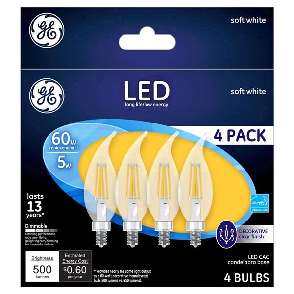 GE?s Soft White LED 60-Watt Replacement Clear Deco light bulb offers outstanding energy efficiency, long-lasting performance and just-right brightness, all in one package. It?s dimmable and illuminates your home with soft, warm light. Use this candelabra-base GE LED decorative bulb in indoor chandeliers, sconces and fixtures where the bulb is visible. Thanks to its aesthetic design, GE?s Soft White LED 60-Watt Replacement Clear Deco light bulb compliments your fixture and adds a decorative touch even when the light is off. When it?s turned on, its long life and low energy use will help you save money on energy. Color: Soft white