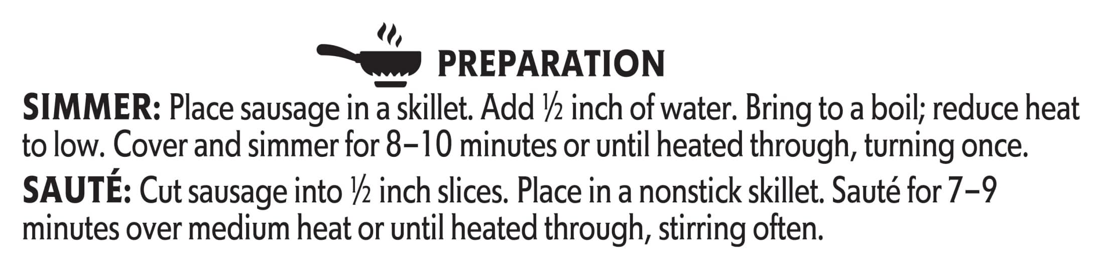 Directions for use: Preparation Simmer: Place sausage in a skillet add 1/2 inch of water. Bring to a boil; reduce heat to low. Cover and simmer for 8-10 minutes or until heated through, turning once. Saute: Cut sausage into 1/2 inch slices. Place in a nonstick skillet. Sauté for 7-9 minutes over medium heat or until heated through, stirring often. Keep refrigerated. Keep refrigerated. Storage & Handling: For optimum freshness, keep refrigerated and use by the date stamped on the package or freeze no longer than 30 days. Open packages should be consumed within 7 days. Easy peel. Open packages should be consumed within 7 days. Storage recommendation: Keep refrigerated. Keep refrigerated. Storage & Handling: For optimum freshness, keep refrigerated and use by the date stamped on the package or freeze no longer than 30 days. Open packages should be consumed within 7 days.