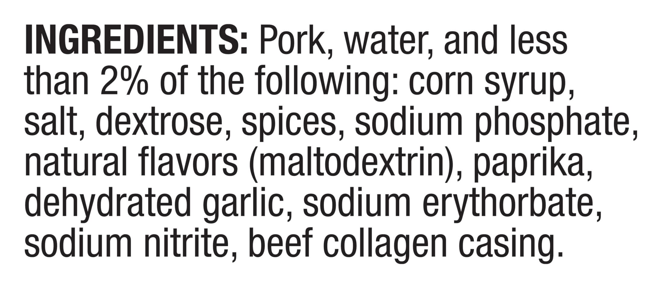 Ingredients: Ingredients: Pork, water, and less than 2% of the following: corn syrup, salt, dextrose, spices, sodium phosphate, natural flavors (maltodextrin), paprika, dehydrated garlic, sodium erythorbate, sodium nitrite, beef collagen casing.