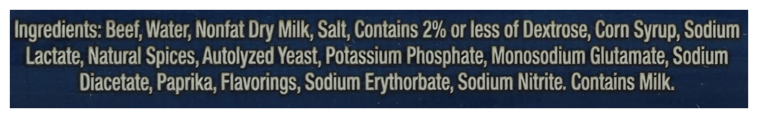 Ingredients: Beef, Water, Nonfat Dry Milk, Salt, Contains 2% or Less of Dextrose, Corn Syrup, Sodium Lactate, Natural Spices, Autolyzed Yeast, Potassium Phosphate, Monosodium Glutamate, Sodium Diacetate, Paprika, Flavorings, Sodium Erythorbate, Sodium Nitrite Contains: Milk