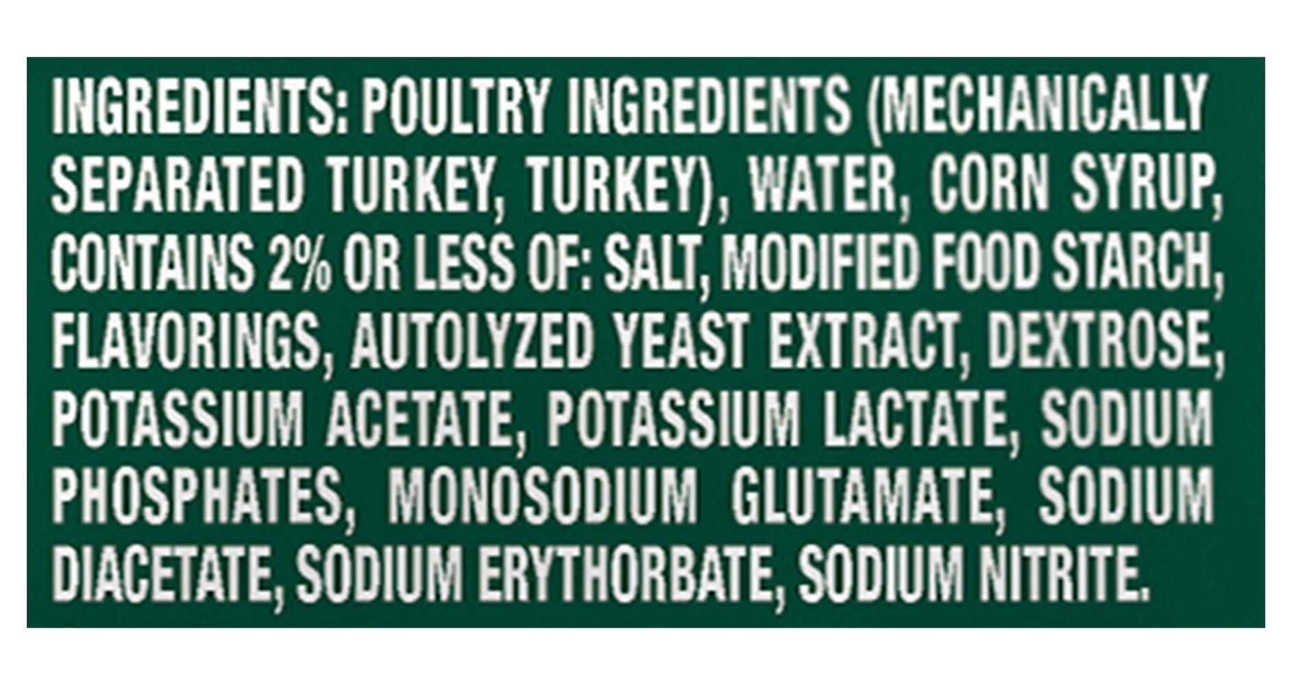 Ingredients: Poultry Ingredients (Mechanically Separated Turkey, Turkey) Water Corn Syrup Contains 2% or Less of: Salt Modified Food Starch Flavorings Autolyzed Yeast Extract Dextrose Potassium Acetate Potassium Lactate Sodium Phosphates Monosodium Glutamate Sodium Diacetate Sodium Erythorbate Sodium Nitrite. Contains: Corn