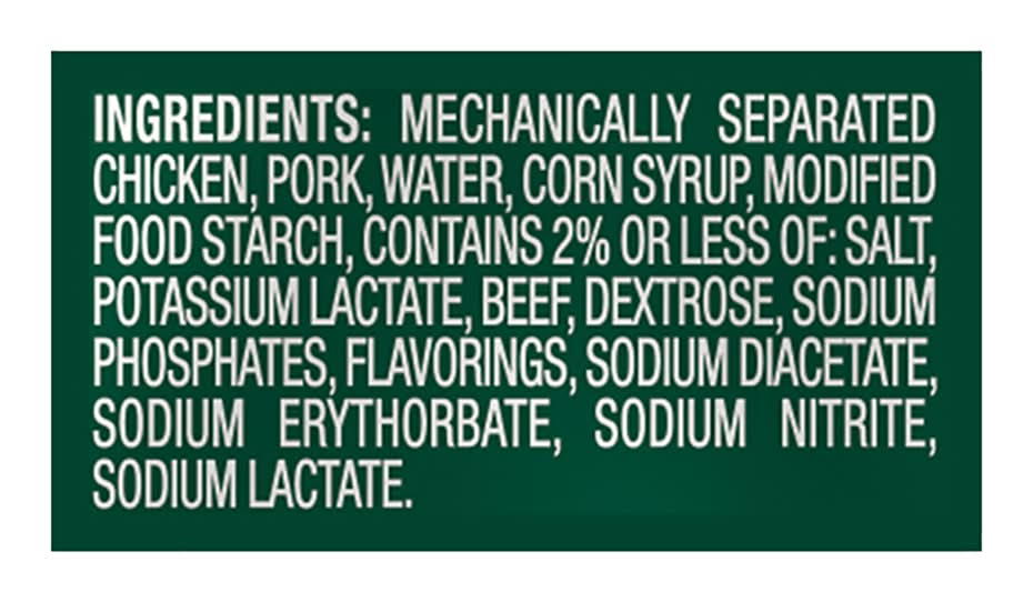 Ingredients: Mechanically Separated Chicken, Pork, Water, Corn Syrup, Modified Food Starch, Contains 2% or Less of: Salt, Potassium Lactate, Beef, Dextrose, Sodium Phosphates, Flavorings, Sodium Diacetate, Sodium Erythorbate, Sodium Nitrite, Sodium Lactate.