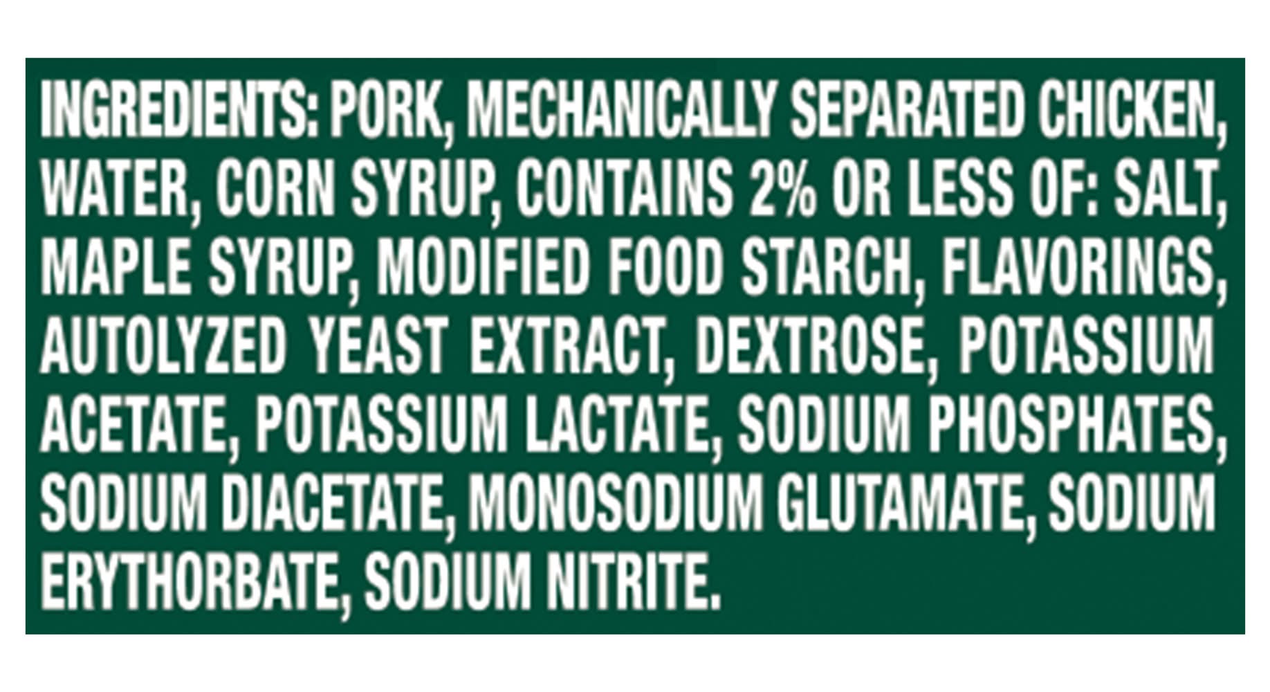 Ingredients: Meat Ingredients (Pork, Beef) Mechanically Separated Turkey Water Corn Syrup Contains 2% or Less of Dextrose Flavorings Maple Syrup Autolyzed Yeast Mechanically Separated Chicken Modified Food Starch Monosodium Glutamate Potassium and Sodium Lactate Salt Sodium Diacetate Sodium Nitrite Sodium Phosphate Vitamin C (Ascorbic Acid). Contains: Corn