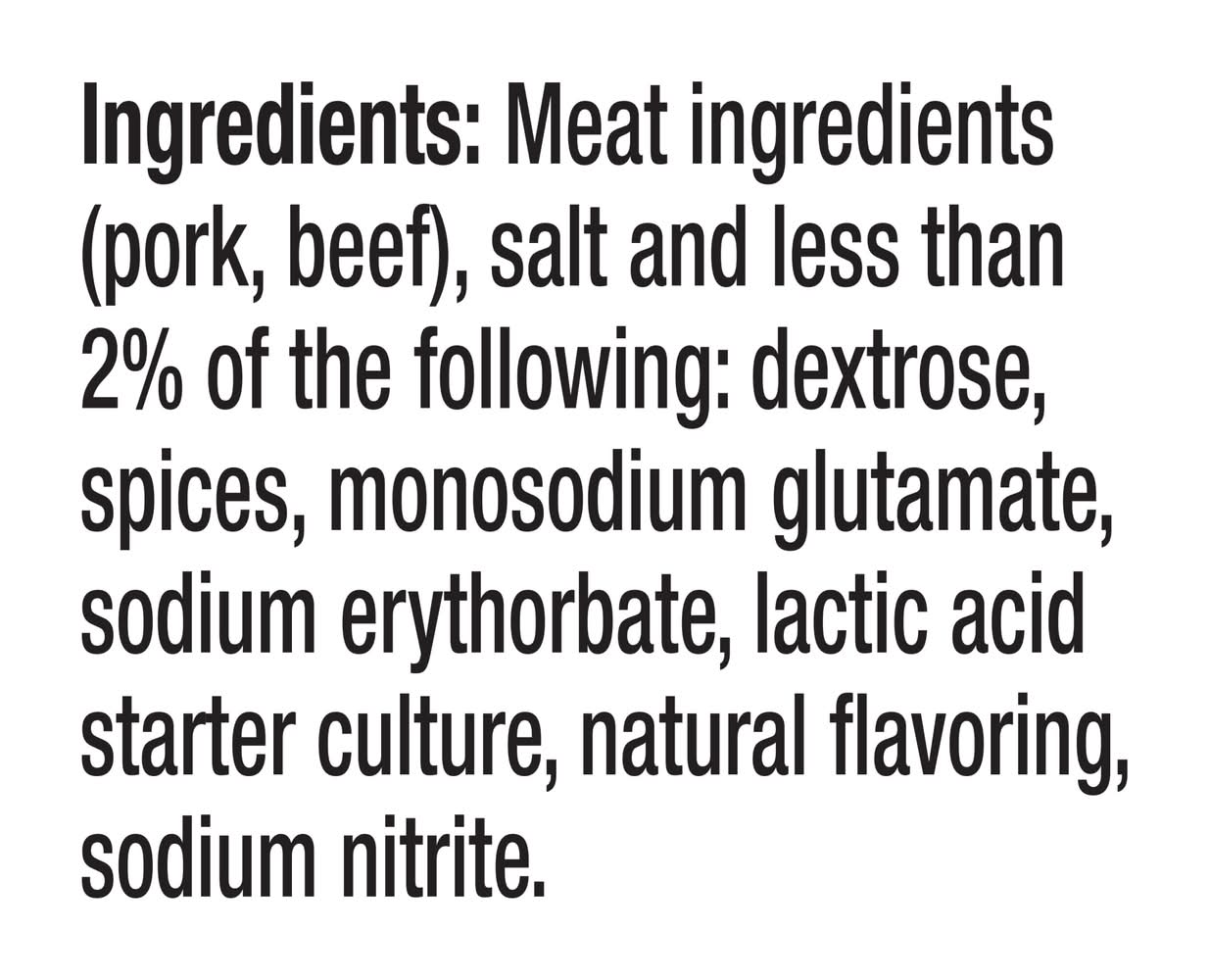 Ingredients: Ingredients: Meat ingredients (pork, beef), salt and less than 2% of the following: dextrose, spices, monosodium glutamate, sodium erythorbate, lactic acid starter culture, natural flavoring, sodium nitrite.