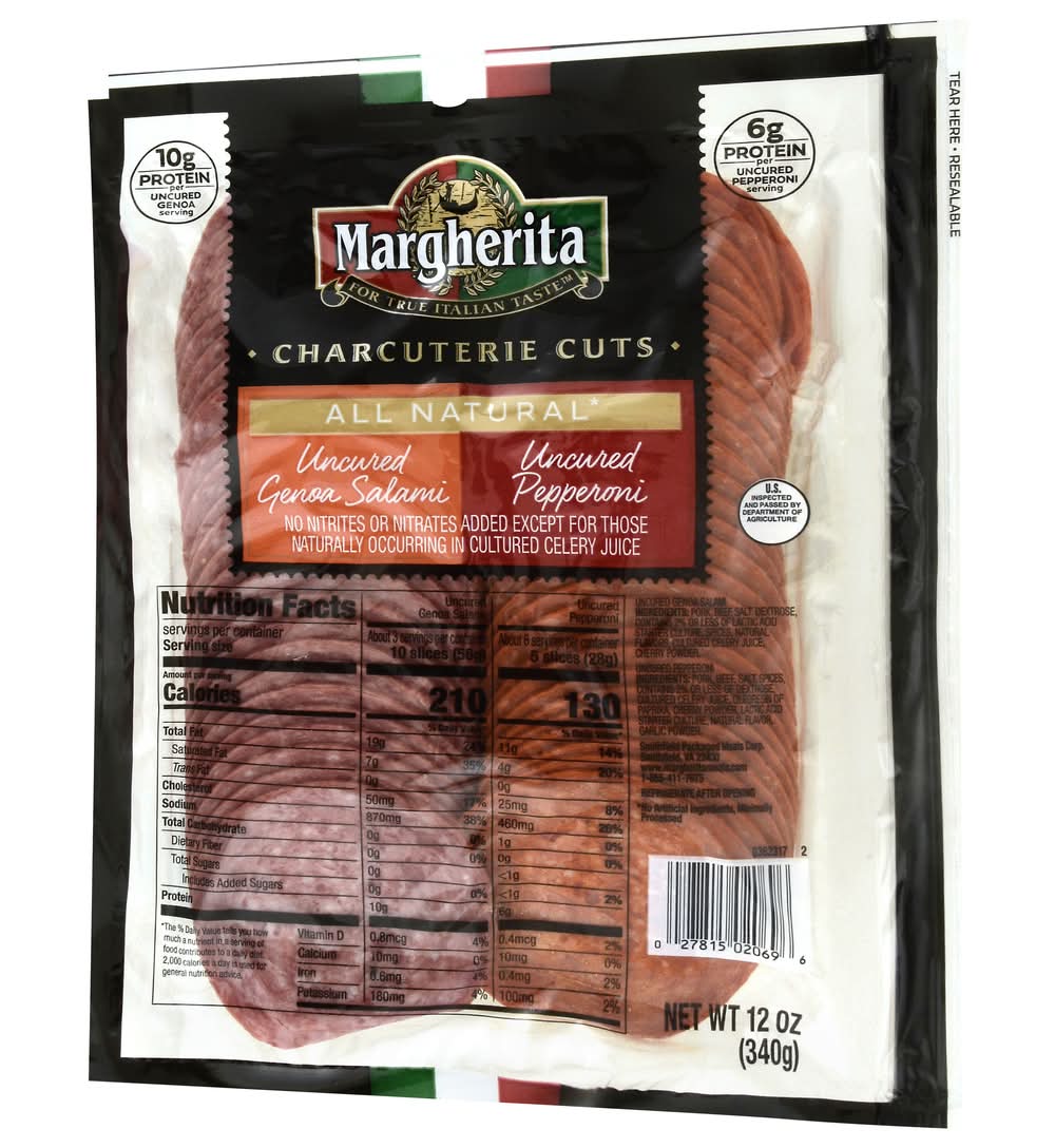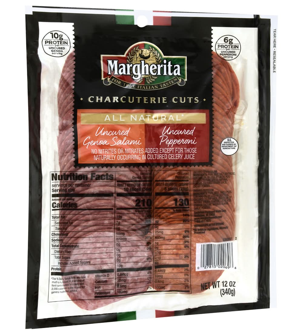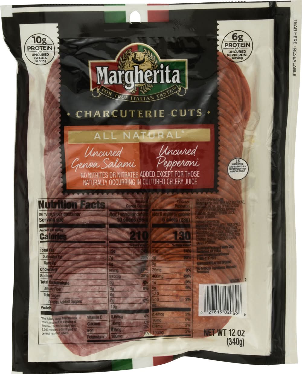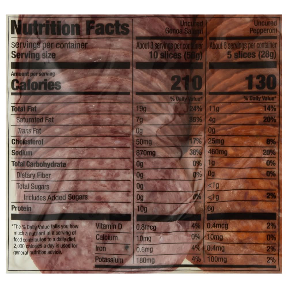 Ingredients: Uncured Genoa Salami: Pork, Beef, Salt, Dextrose Contains 2% or Less of Lactic Acid Starter Culture, Spices, Natural Flavors, Cultured Celery Juice, Cherry Powder. Uncured Pepperoni: Pork, Beef, Salt, Spices, Contains 2% or Less of Dextrose, Cultured Celery Juice, Oleoresin of Paprika, Cherry Powder, Lactic Acid Starter Culture, Natural Flavor, Garlic Powder. Contains: Celery