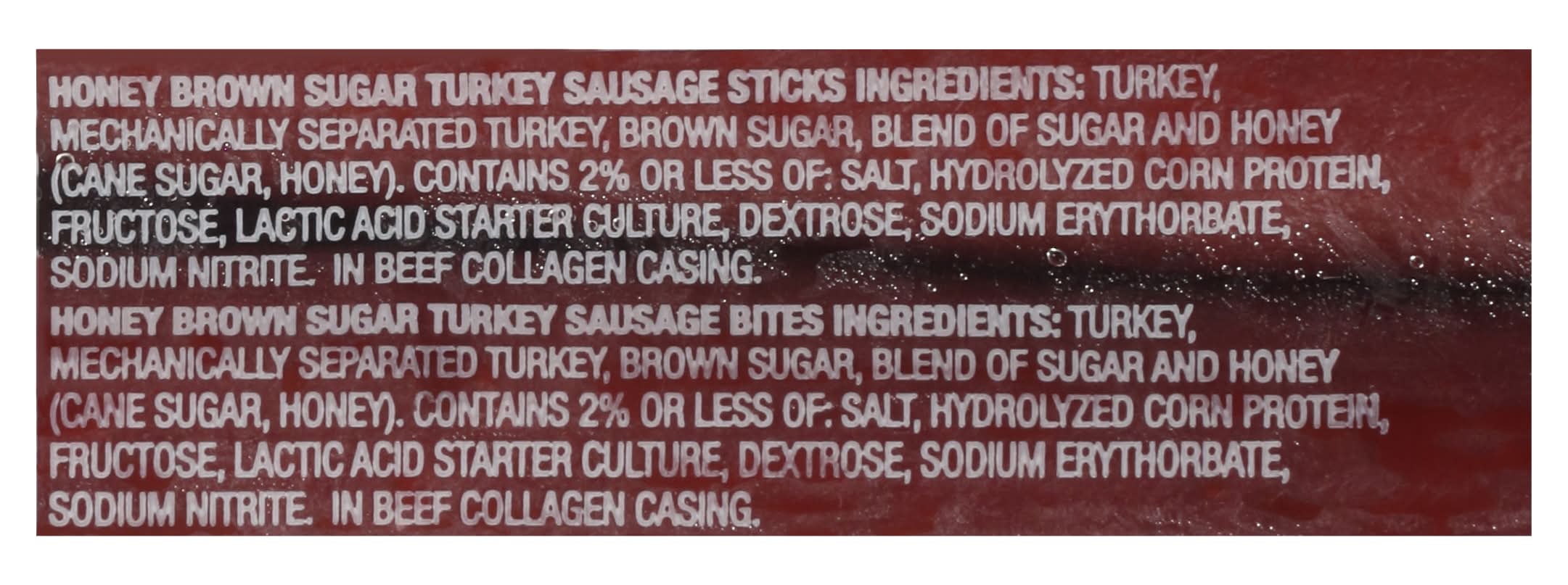 Ingredients: Turkey, Mechanically Separated Turkey, Brown Sugar, Blend of Sugar and Honey (Cane Sugar, Honey), Contains 2% or Less of: Salt, Hydrolyzed Corn Protein, Fructose, Lactic Acid Starter Culture, Dextrose, Sodium Erythorbate, Sodium Nitrite. in Beef Collagen Casing Contains: Corn