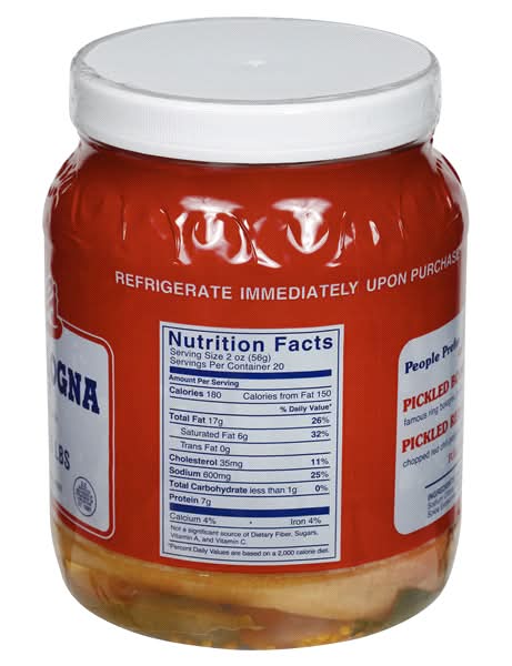 Ingredients: Beef, Pork, Water, Nonfat Dry MIlk, Salt, Spices, Sugar, Sodium Citrate, Dextrose, Paprika, Sodium Diacetate, Sodium Erythorbate, Spice Extractives, Garlic, Sodium Nitrite, Pickled in a solution of vinegar.
