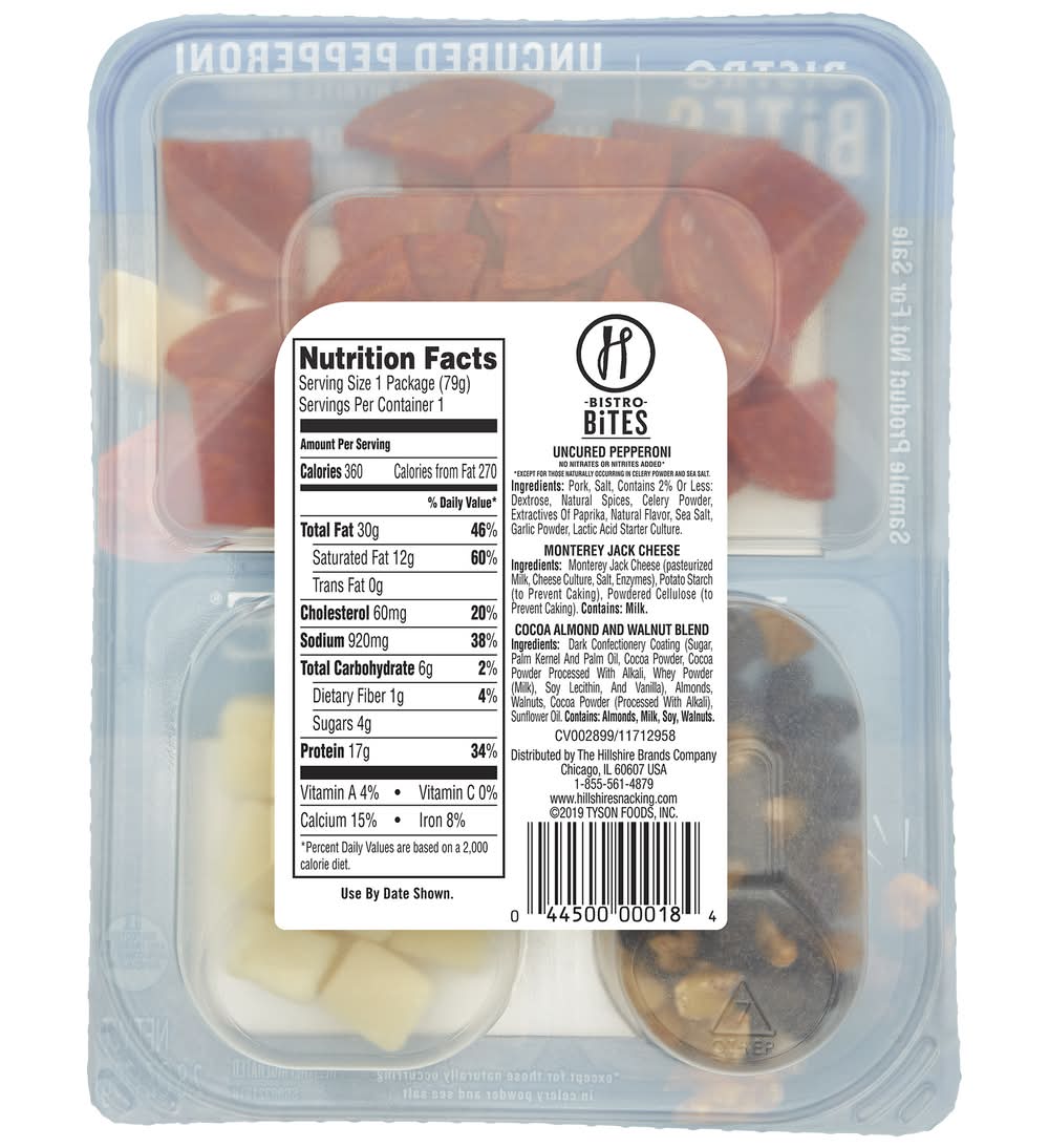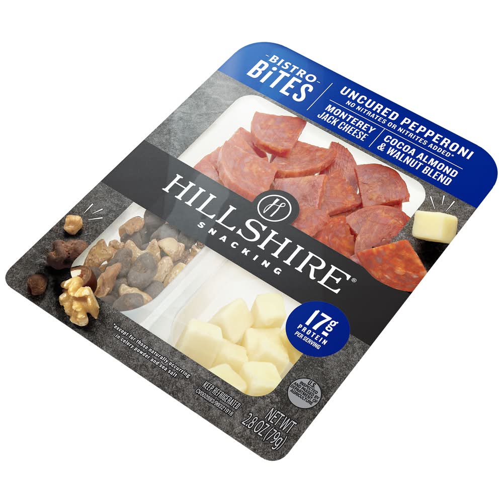 Uncured Pepperoni & Monterey Jack Cheese and Cocoa Almond & Walnut Blend Bistro Bites • The Hillshire Brands Company, Chicago,IL,60607,USA • Packaging: Reusable