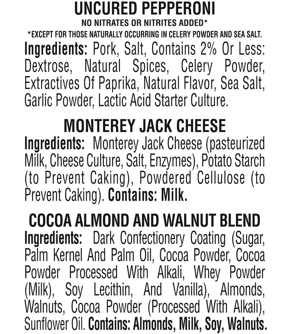 Ingredients: UNCURED PEPPERONI: Pork, salt, contains 2% or less: dextrose, natural spices, celery powder, extractives of paprika, natural flavor, sea salt, garlic powder, lactic acid starter culture. MONTEREY JACK CHEESE: Monterey jack cheese (pasteurized milk, cheese culture, salt, enzymes), potato starch (to prevent caking), powdered cellulose (to prevent caking). COCOA ALMOND AND WALNUT BLEND: Dark confectionery coating (sugar, palm kernel and palm oil, cocoa powder, cocoa powder processed with alkali, whey powder (milk), soy lecithin, and vanilla), almonds, walnuts, cocoa powder (processed with alkali), sunflower oil. Contains: Milk, Tree Nuts, Soy