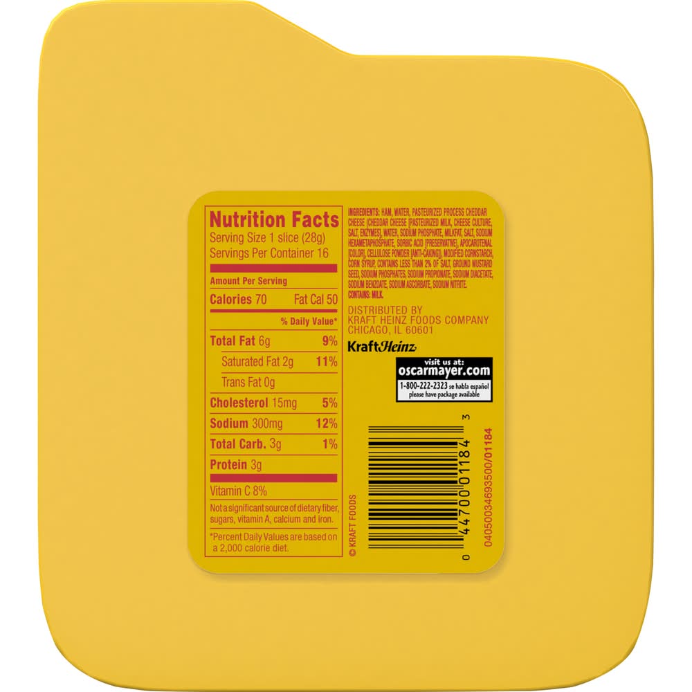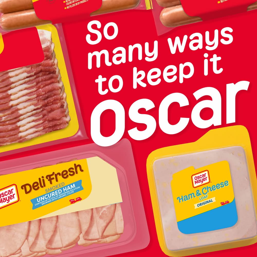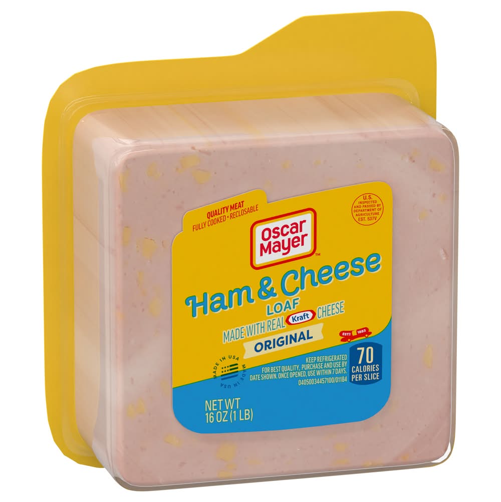 Enjoy the delicious combination of ham and cheese in one. Oscar Mayer Ham & Cheese Loaf Lunch Meat is made with quality meat and real Kraft cheese. With a rich, classic ham flavor mixed with cheesy goodness, our fully cooked ham lunch meat is ready to eat. Add Oscar Mayer lunch meat to sandwiches, wraps or deli platters. Ham and cheese loaf also makes a great snack when eaten with crackers. Keep our 16-ounce pack of ham and cheese loaf sandwich meat refrigerated in the resealable package to ensure freshness. If you enjoy our ham & cheese loaf, be sure to try the other varieties of Oscar Mayer lunch meat. Kraft Heinz Foods Company, Chicago,IL,60601