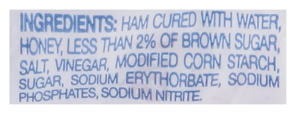 Ingredients: Ham Cured with Water, Honey, Less than 2% of Brown Sugar, Salt, Vinegar, Modified Corn Starch, Sugar, Sodium Erythorbate, Sodium Phosphates, Sodium Nitrite Contains: Corn