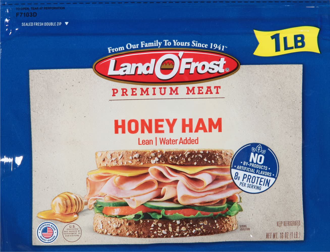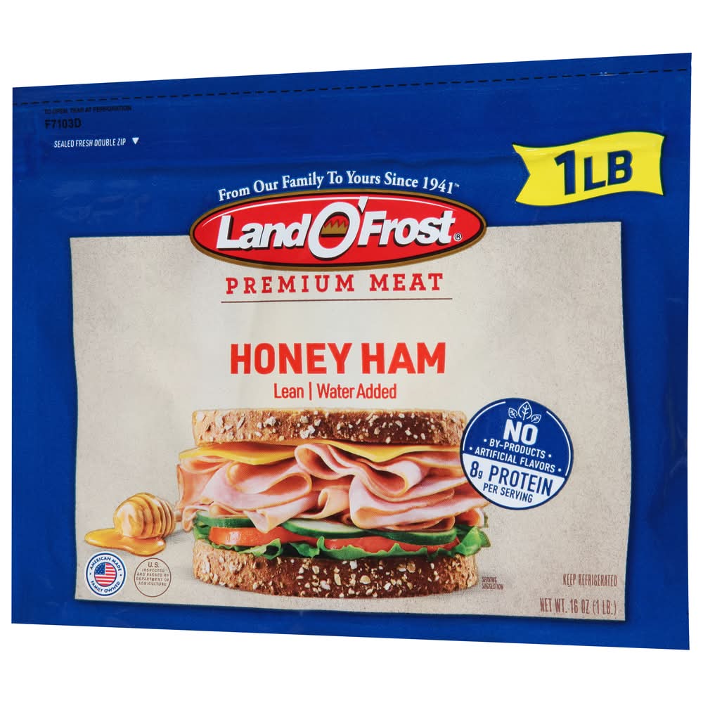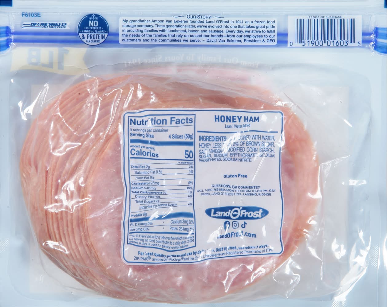 From our family to yours since 1941. Lean. Water added. 1 lb. No: By-products; artificial flavors. Our Story: My grandfather Antoon Van Eekeren founded Land O'Frost in 1941 as a frozen food storage company. Three generations later, we've evolved into one the takes great pride in providing families with lunchmeat, bacon and sausage. Every day, we strive of fulfill the needs of the families that rely on us and our brands - from our employees to our customers and the communities we serve. David Van Eekeren, President & CEO. U.S. inspected and passed by Department of Agriculture. • Flavor: Honey • Land O'frost Inc., Lansing, Il, 60438