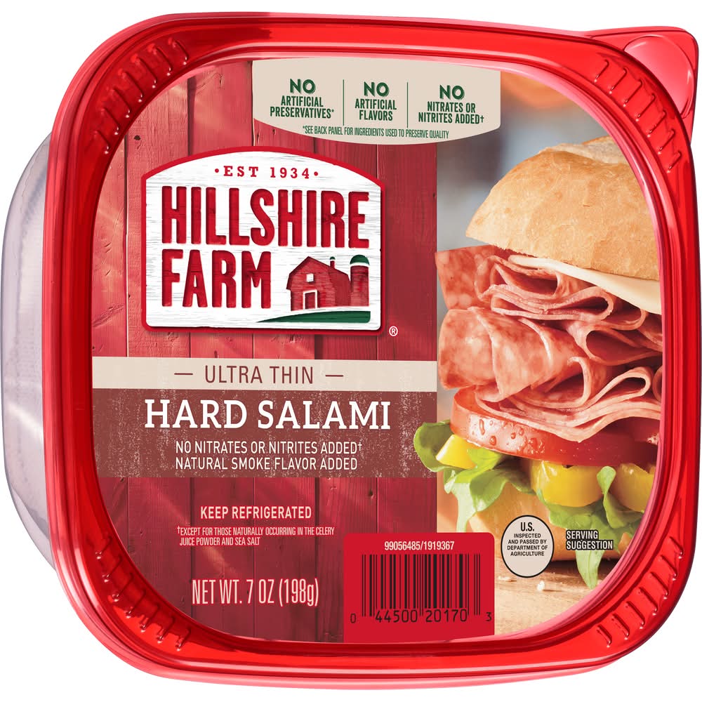 Can a sandwich crafted with delectably roasted cuts make your tastebuds quake with yearning? For Sure, It's Hillshire! Bring the goodness of the farm to your table and experience the taste of a homestyle sandwich made with Hillshire Farm Ultra Thin Sliced Hard Salami Sandwich Meat. Made with perfectly seasoned, uncured beef and pork, our hard salami is juicy and flavorful. Our farmhouse quality hard salami is made with no artificial preservatives or flavors, and no nitrates or nitrites added (except for those naturally occurring in the celery juice powder and sea salt). Try our sliced hard salami in a sandwich or wrap, on a salad or as part of a charcuterie board. Each 7-ounce package of Hillshire Farm Hard Salami is double sealed for freshness and flavor. At Hillshire Farm brand, we are committed to the values of the farm, and we know that quality is always the most important ingredient. You can taste the generations of care and craftsmanship in every recipe because farmhouse values never go out of season. Hillshire Brands, Chicago, IL 60607