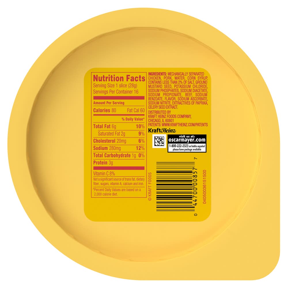 Oscar Mayer has a way with bologna. Our Oscar Mayer Bologna Made with chicken, pork and beef added, Lunch Meat is quality sliced meat made without fillers, so you can enjoy the taste you want with nothing you don't. Enjoy bologna slices on wheat bread with American cheese for a delicious bologna sandwich, or add it to deli platters for party guests to mix and match their favorite sandwich meats with other flavors. Oscar Mayer Bologna slices are the ideal sandwich meat for kids and parents alike. Fully cooked, our Oscar Mayer Bologna lunch meat is ready to eat. Kraft Heinz Foods Company, Chicago,IL,60601
