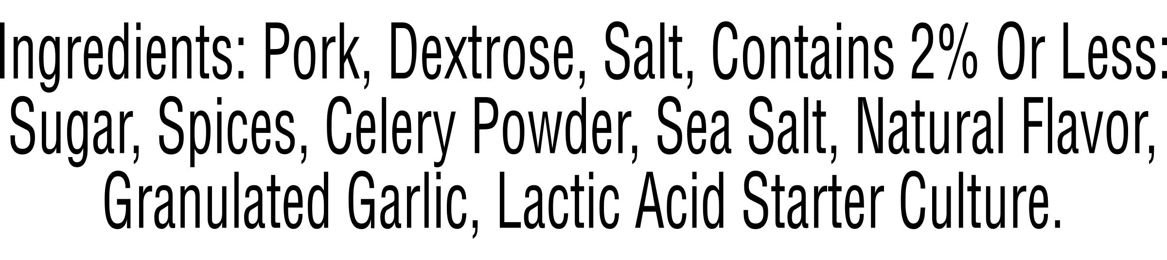 Ingredients: Pork, Dextrose, Salt, Contains 2% or Less: Sugar, Spices, Celery Powder, Sea Salt, Natural Flavor, Granulated Garlic, Lactic Acid Starter Culture. Contains: 'Free From Gluten'