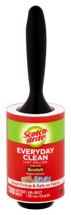 Scotch-Brite Lint Roller is equipped with Scotch Brand adhesive, designed to effectively pick up fur, fluff, and other particles. It features an ergonomic handle, ensuring comfortable use. This product is suitable for various locations like home, car, and office, and can be used for quick touchups.