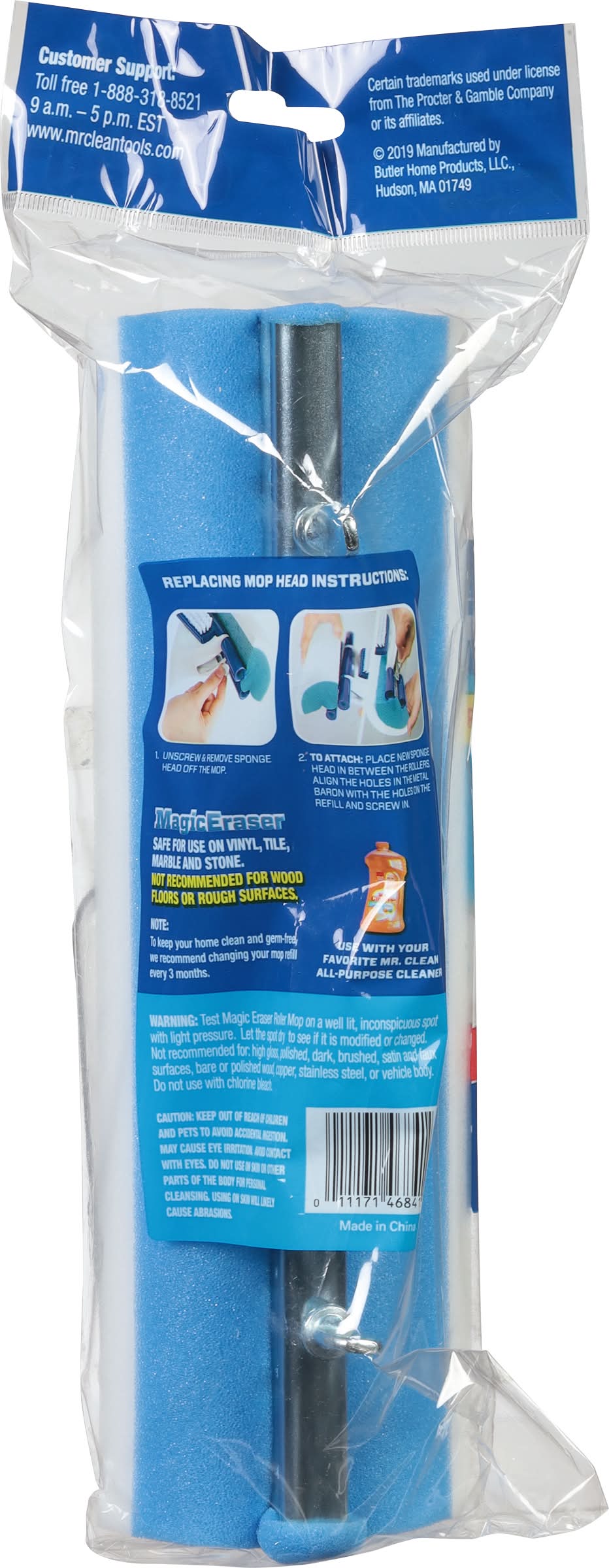 Removing mop head instructions: 1. unscrew & remove sponge head off the mop. 2. to attach: place new sponge head in between the rollers & align the holes in the metal bar on the mop with the holes on the refill. screw in. (screws included). attention: the mr. clean magic eraser roller mop is highly effective cleaning tool. test first on a well lit, inconspicuous spot with ligth pressure. let the spot dry to see if it is modified or damaged. not recommended for the following surfaces: high gloss, polished, dark, brushed, satin, faux, bare/polished wood, or stainless stee. do not use with chlorine bleach, on vehicle body or post-factory tinted glass.