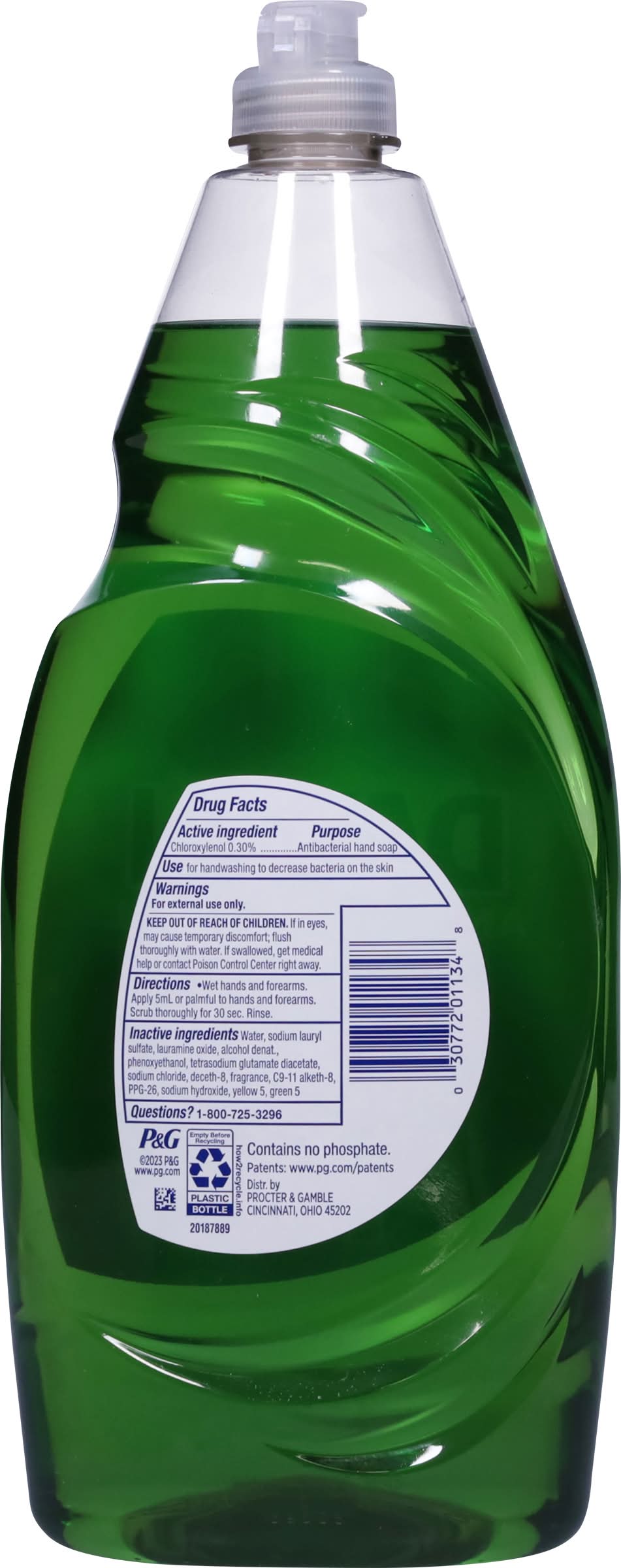 Chloroxylenol antibacterial hand soap. 50% less scrubbing (vs. Dawn non-concentrated). Contains no phosphate • Procter & Gamble, Cincinnati,OH,45202 • Packaging: Reusable