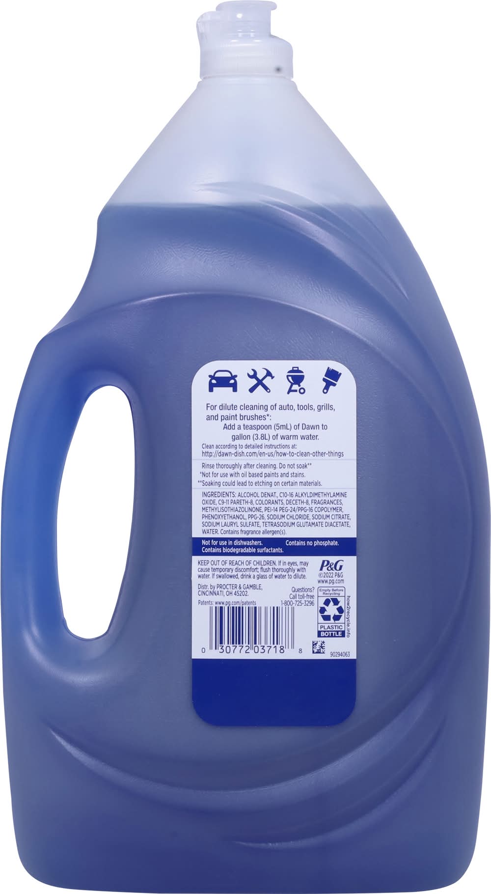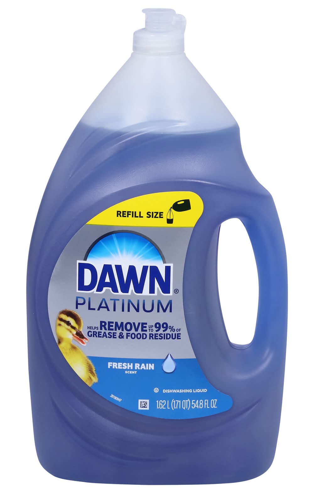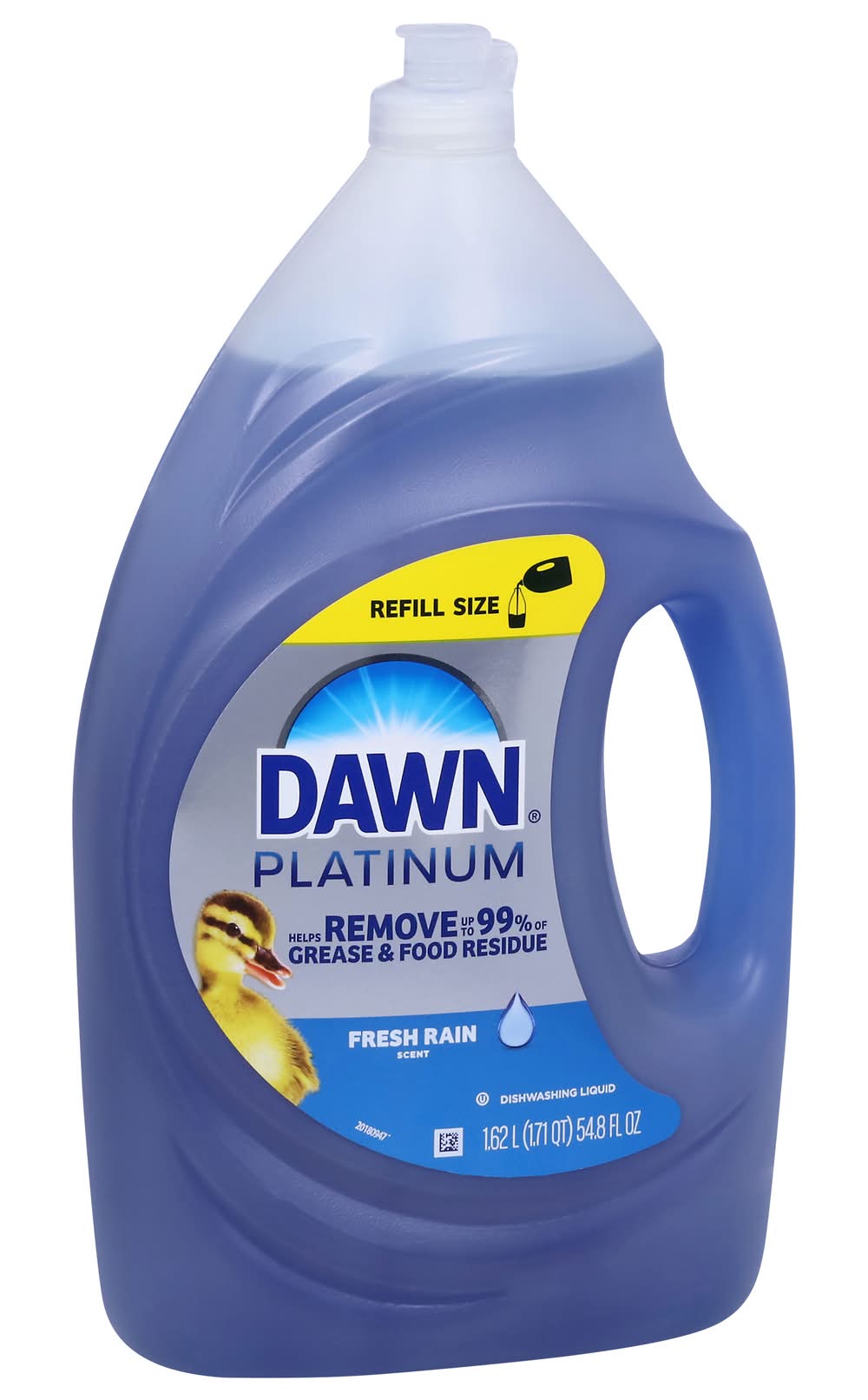 Dawn Platinum gives you a squeaky clean that you can see and feel. Dawn Platinum's improved formula easily removes 99% of grease and food residue. Dawn helps save wildlife. For more than 40 years, Dawn has helped save wildlife both at the sink, with products designed to get dishes cleaner faster, using less water*, and at the shore, where we work with wildlife rescue experts to protect and care for aquatic wildlife (*vs. running the tap with Dawn Non-Concentrated). Dawn is the only brand of dish soap trusted by rescue workers to clean wildlife impacted by oil spills. Dawn dishwashing liquid can even be used to clean items beyond the kitchen sink. Use Dawn Platinum dish soap to pre-treat greasy laundry stains, remove grease and grime from kitchen counters and appliances, and to clean external car surfaces and the outer shroud of a gas grill. Dawn Ultra's powerful formula helps you get through more dishes with less* dishwashing liquid (*vs. Dawn Non-Concentrated). Made with Biodegradable surfactants. • Procter & Gamble, Cincinnati,OH,45202 • Packaging: Reusable