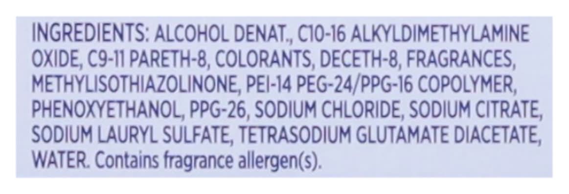 Ingredients: Alcohol Denat, C10-16 Alkyldimethylamine Oxide, C9-11 Pareth-8, Colorants, Deceth-8, Fragrances, Methylisothiazolinone, PEI-14 PEG-24/PPG-16 Copolymer, Phenoxyethanol, PPG-26, Sodium Chloride, Sodium Citrate, Sodium Lauryl Sulfate, Tetrasodium Glutamate Diacetate, Water