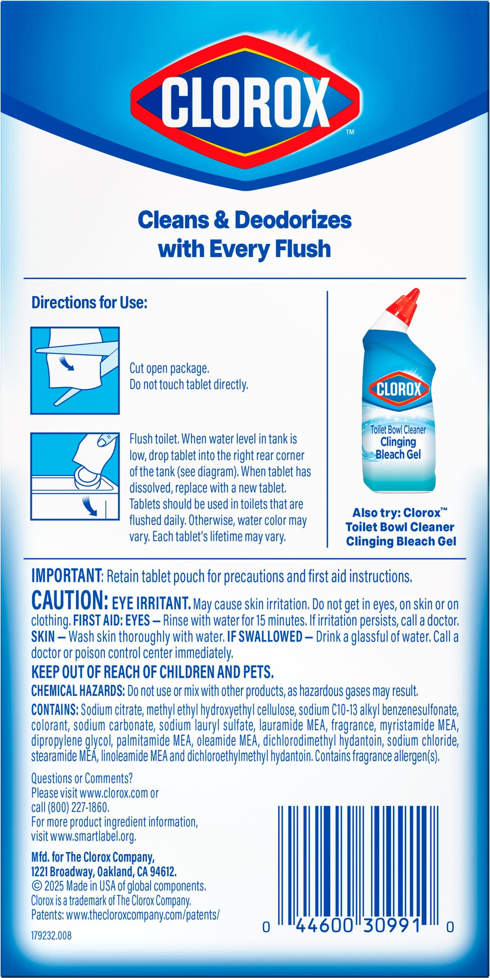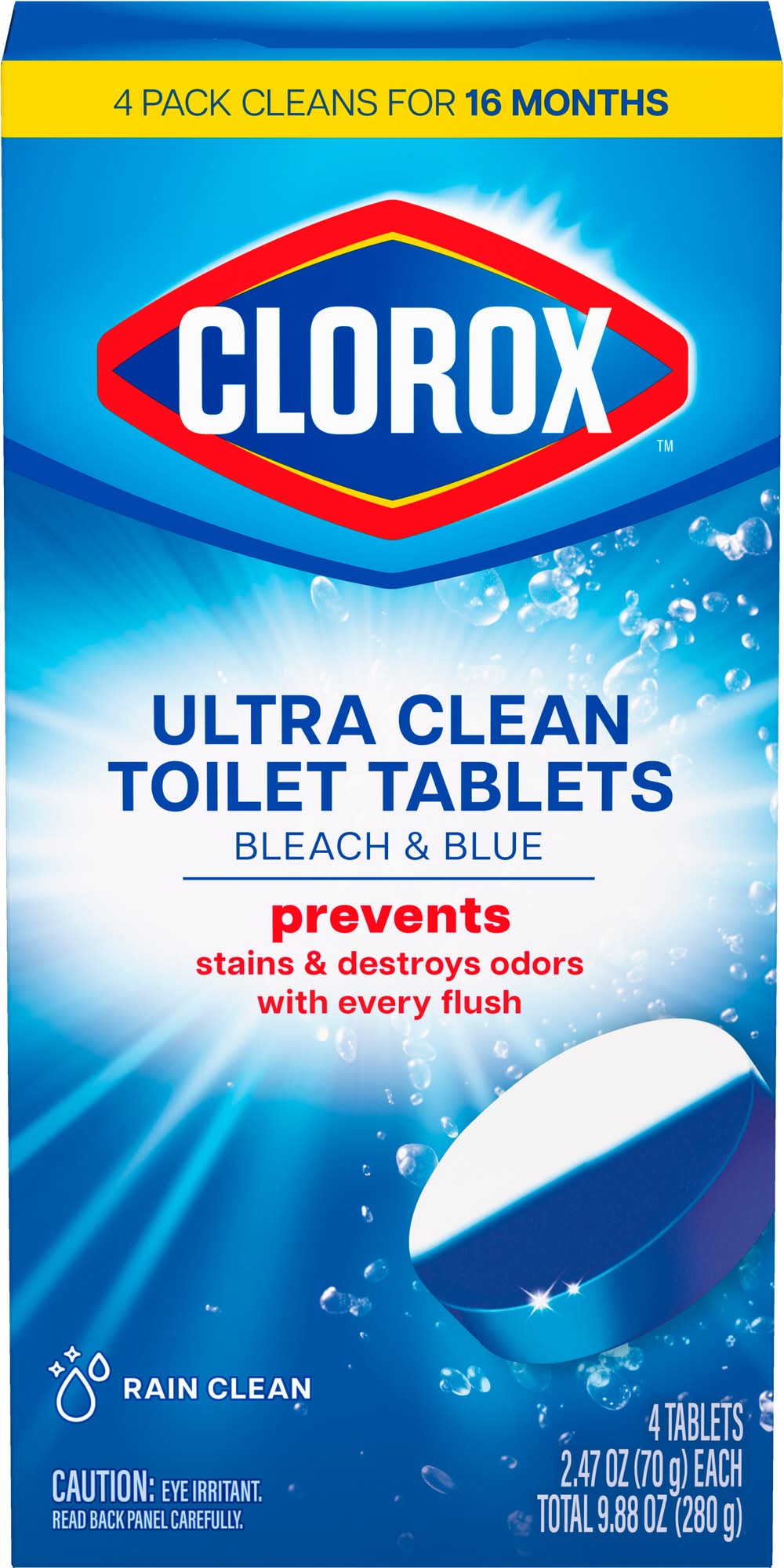 Clean your toilet bowl and leave it sanitized with every flush with the help of Clorox Ultra Clean Toilet Tablets Bleach & Blue in a Rain Clean Scent. • Pack size: 4 • Clorox, Oakland, CA, 94612, Ph: 800-227-1860 • Packaging: Reusable