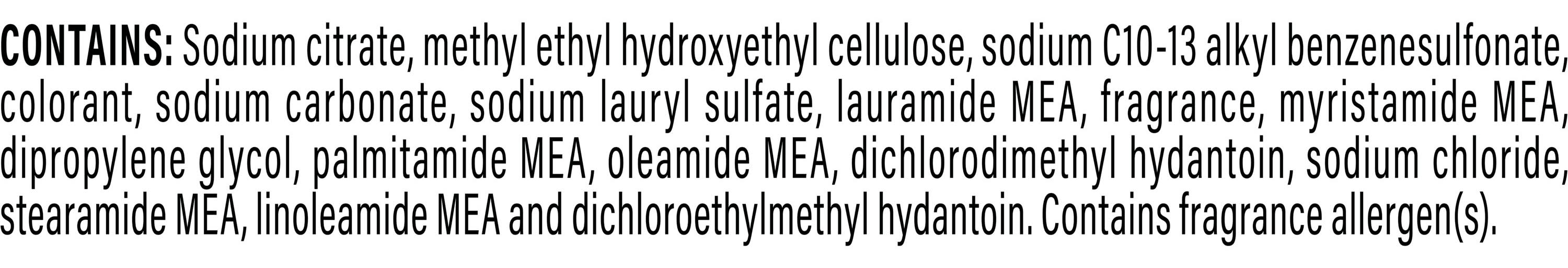 Ingredients: CONTAINS: Sodium citrate, methyl ethyl hydroxyethyl cellulose, sodium C10-13 alkyl benzenesulfonate, colorant, sodium carbonate, sodium lauryl sulfate, lauramide MEA, fragrance, myristamide MEA, dipropylene glycol, palmitamide MEA, oleamide MEA, dichlorodimethyl hydantoin, sodium chloride, stearamide MEA, linoleamide MEA and dichloroethylmethyl hydantoin. Contains fragrance allergen(s).