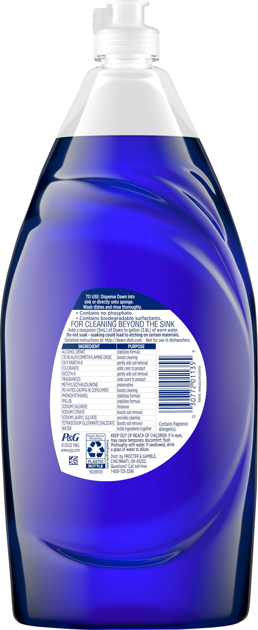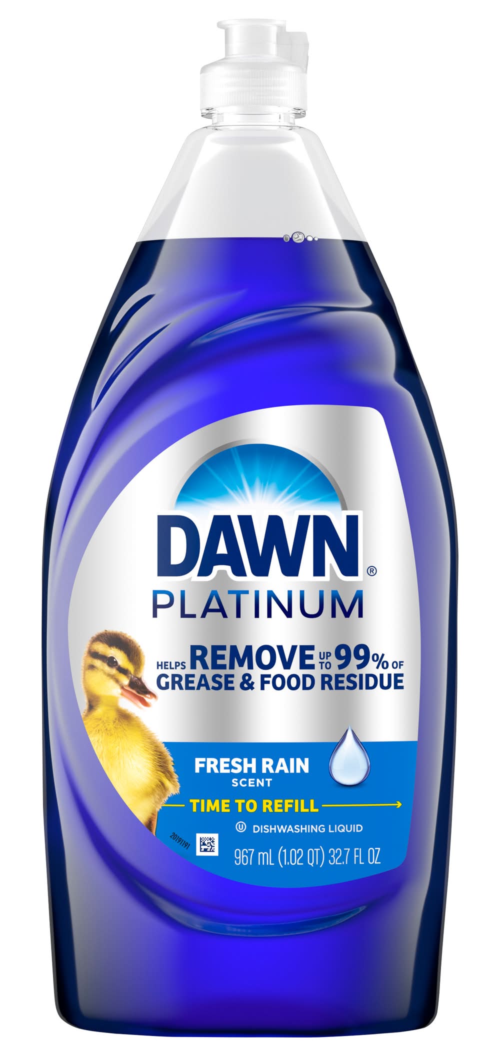 Dawn Platinum gives you a squeaky clean that you can see and feel. Dawn Platinum's improved formula easily removes 99% of grease and food residue. Dawn helps save wildlife. For more than 40 years, Dawn has helped save wildlife both at the sink, with products designed to get dishes cleaner faster, using less water*, and at the shore, where we work with wildlife rescue experts to protect and care for aquatic wildlife (*vs. running the tap with Dawn Non-Concentrated). Dawn is the only brand of dish soap trusted by rescue workers to clean wildlife impacted by oil spills. Dawn dishwashing liquid can even be used to clean items beyond the kitchen sink. Use Dawn Platinum dish soap to pre-treat greasy laundry stains, remove grease and grime from kitchen counters and appliances, and to clean external car surfaces and the outer shroud of a gas grill. Dawn Ultra's powerful formula helps you get through more dishes with less* dishwashing liquid (*vs. Dawn Non-Concentrated). Made with Biodegradable surfactants. • Procter & Gamble, Cincinnati, OH, 45202 • Packaging: Reusable