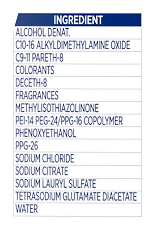 Ingredients: Alcohol Denatured, C10-16 Alkyldimethylamine Oxide, C9-11 Pareth-8, Colorants, Deceth-8, Fragrances, Methylisothiazolinone, Pei-14 PEG-24/PPG-16 Copolymer, Phenoxyethanol, PPG-26, Sodium Chloride, Sodium Citrate, Sodium Lauryl Sulfate, Tetrasodium Glutamate Diacetate, Water