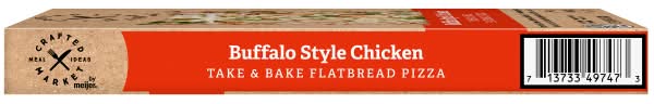 Crafted Market by Meijer's Buffalo Style Chicken Flatbread Pizza is a flavorful blend of mozzarella, seasoned chicken, and green onions on a flatbread crust. Ready in just 10-12 minutes, this take and bake pizza offers a quick, satisfying meal.
