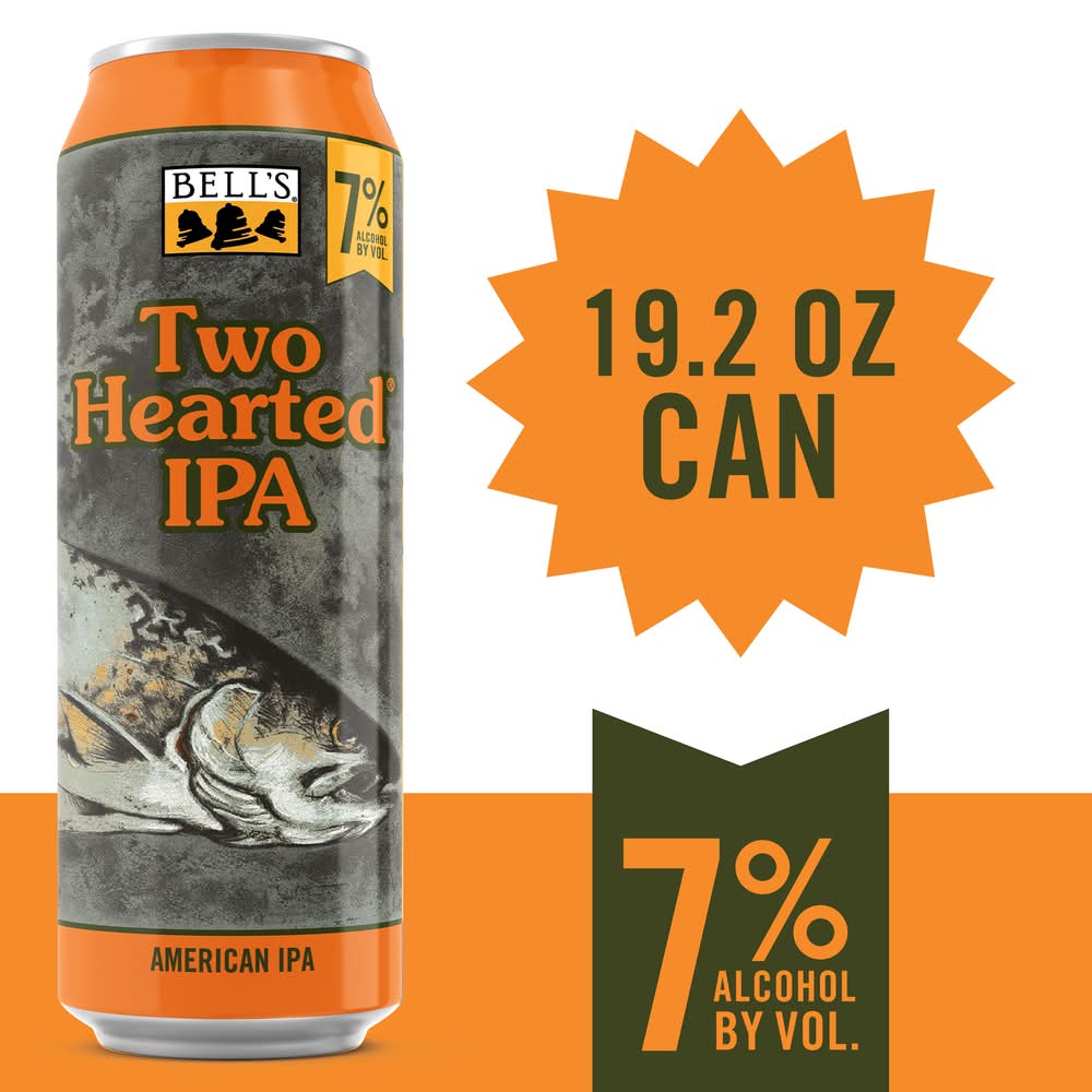 Two Hearted IPA from Bell's Brewery is an iconic American IPA suited for adventures everywhere. It's bursting with fresh hop aromas from 100% Centennial hops. It features bright, satisfying flavors that are smooth and refreshing. Two Hearted is piney, malty and bitter-forward, with hints of citrus. Overall, it is a very classic, balanced, and drinkable IPA. Named after fishing waters in Michigan's Upper Peninsula, it's beloved by longtime and new craft beer drinkers alike. 7% ABV. • Alcohol by volume: 7% • Packaging: Reusable