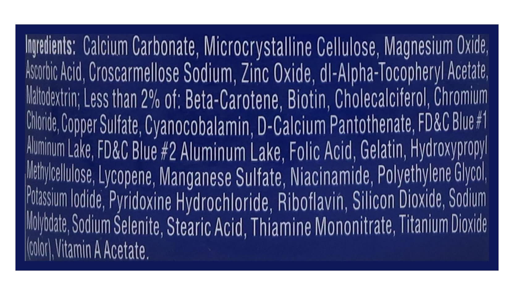 Ingredients: Calcium Carbonate, Microcrystalline Cellulose, Magnesium Oxide, Ascorbic Acid, Croscarmellose Sodium, Zinc Oxide, DL-Alpha-Tocopheryl Acetate, Maltodextrin; Less than 2% of: Beta-Carotene, Biotin, Cholecalciferol, Chromium Chloride, Copper Sulfate, Cyanocobalamin, D-Calcium Pantothenate, FD&C Blue #1 Aluminum Lake, FD&C Blue #2 Aluminum Lake, Folic Acid, Gelatin, Hydroxypropyl Methylcellulose, Lycopene, Manganese Sulfate, Niacinamide, Polyethylene Glycol, Potassium Iodide, Pyridoxine Hydrochloride, Riboflavin, Silicon Dioxide, Sodium Molybdate, Sodium Selenite, Stearic Acid, Thiamine Mononitrate, Titanium Dioxide (Color), Vitamin A Acetate