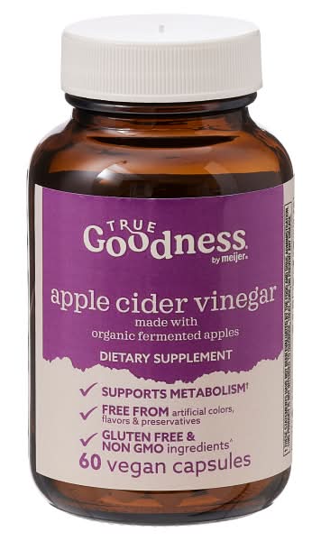 True Goodness Apple Cider Vinegar Supplements are capsules designed to offer the advantages of apple cider vinegar. These supplements include pure apple cider vinegar with the "Mother" and are confirmed to be gluten-free, vegan, and non-GMO. They are intended to support digestion, metabolism, and overall well-being. Each bottle provides a count of 60 capsules.