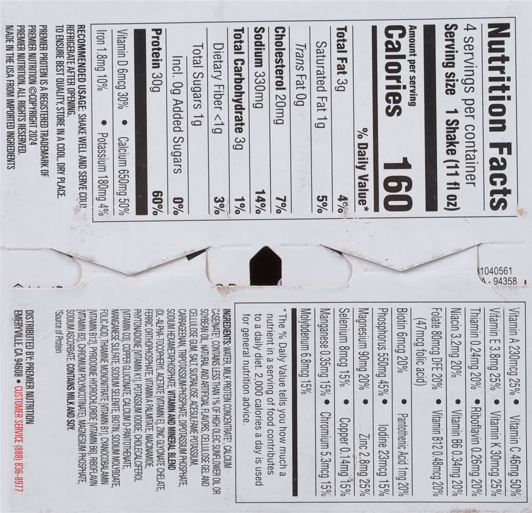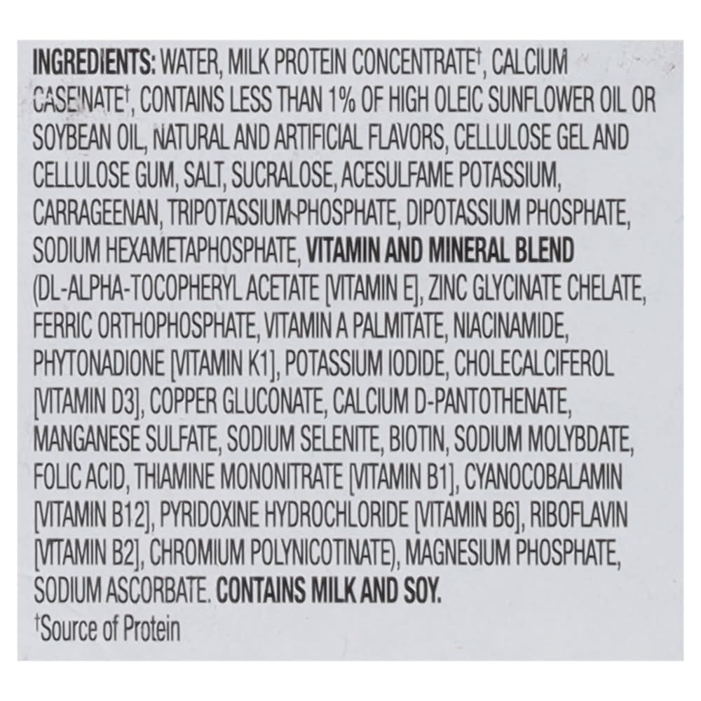 Ingredients: Water, Milk Protein Concentrate, Calcium Caseinate(B), Contains Less than 1% of High Oleic Sunflower Oil or Soybean Oil, Natural and Artificial Flavors, Cellulose Gel and Cellulose Gum, Salt, Sucralose, Acesulfame Potassium, Carrageenan, Tripotassium-Phosphate, Dipotassium Phosphate, Sodium Hexametaphosphate, Vitamin and Mineral Blend (DL-Alpha-Tocopheryl Acetate [Vitamin E], Zinc Glycinate Chelate, Ferric Orthophosphate, Vitamin A Palmitate, Niacinamide, Phytonadione [Vitamin K1], Potassium Iodide, Cholecalciferol [Vitamin D3], Copper Gluconate, Calcium D-Pantothenate, Manganese Sulfate, Sodium Selenite, Biotin, Sodium Molybdate, Folic Acid, Thiamine Mononitrate [Vitamin B1], Cyanocobalamin [Vitamin B12], Pyridoxine Hydrochloride [Vitamin B6], Riboflavin [Vitamin B2], Chromium Polynicotinate), Magnesium Phosphate, Sodium Ascorbate, (B) Source of Protein Contains: Milk, Soybeans