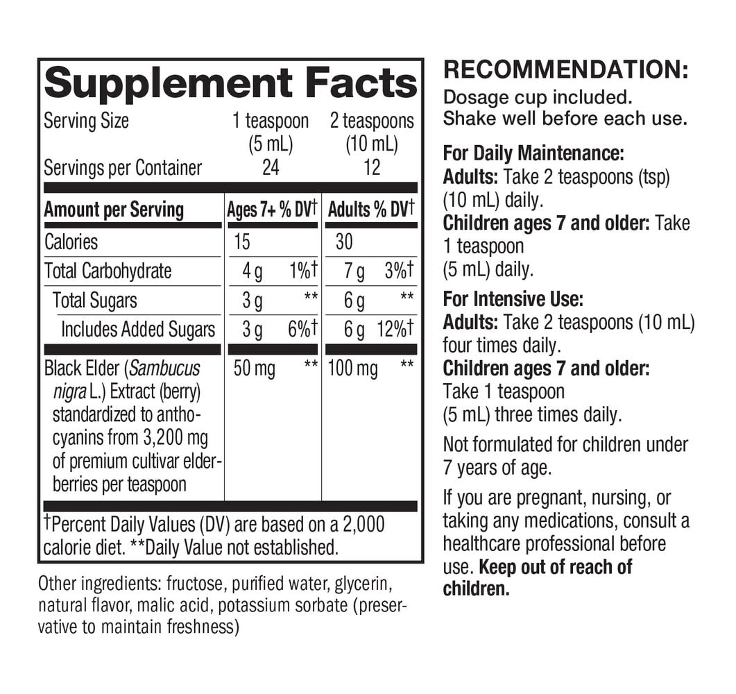 Ingredients: Black Elder (Sambucus nigra L.) Extract (berry) standardized to anthocyanins from 3, 200 mg of premium cultivar elderberries per teaspoon; Fructose; Purified Water; Glycerin; Natural Flavor; Malic Acid; Potassium Sorbate (Preservative To Maintain Freshness)