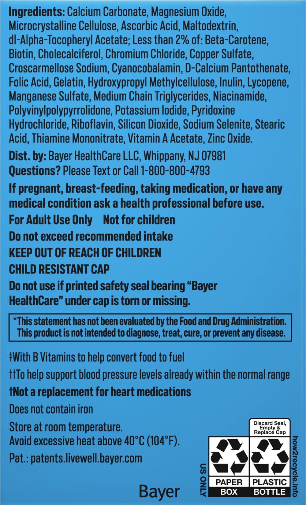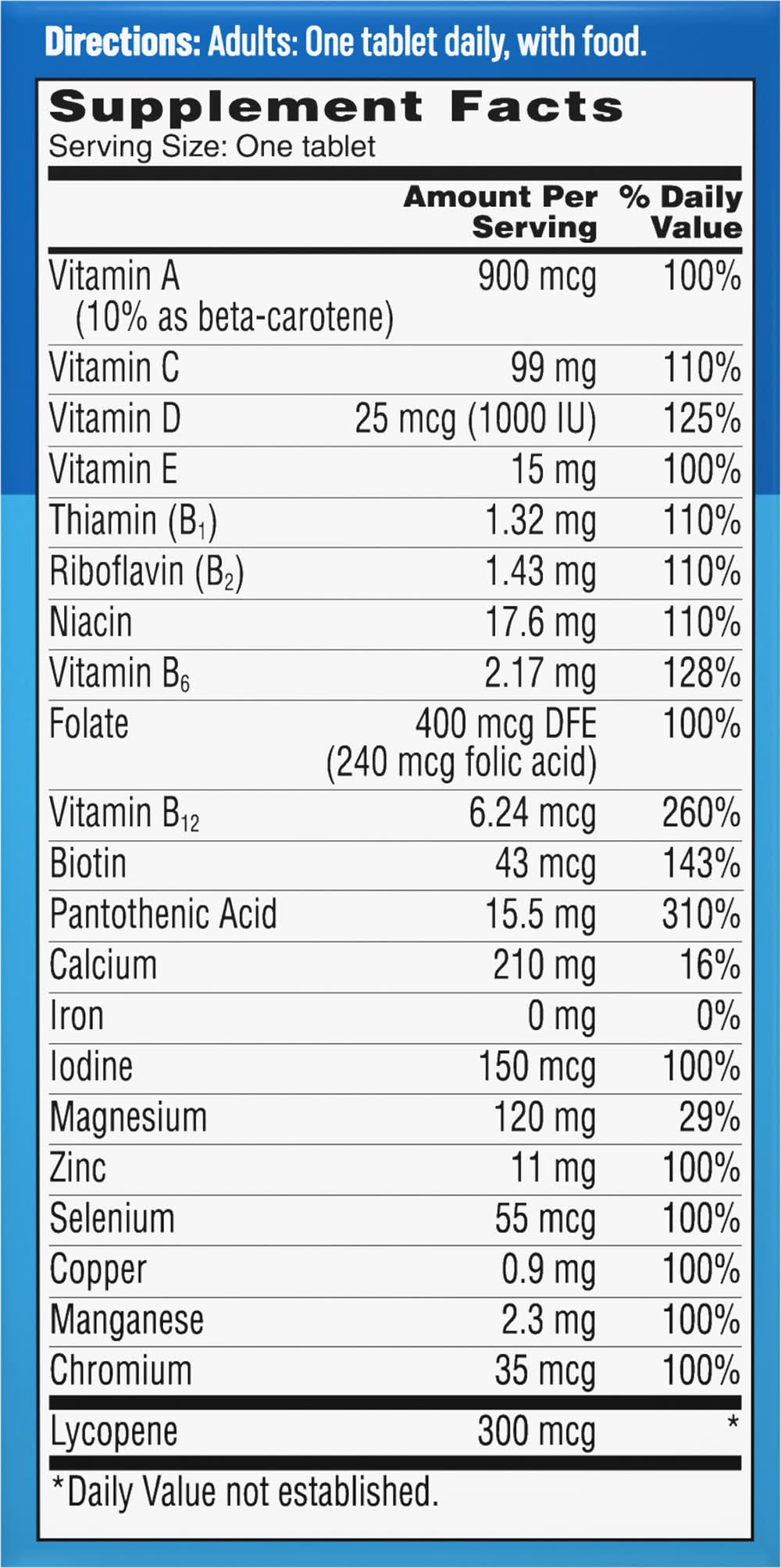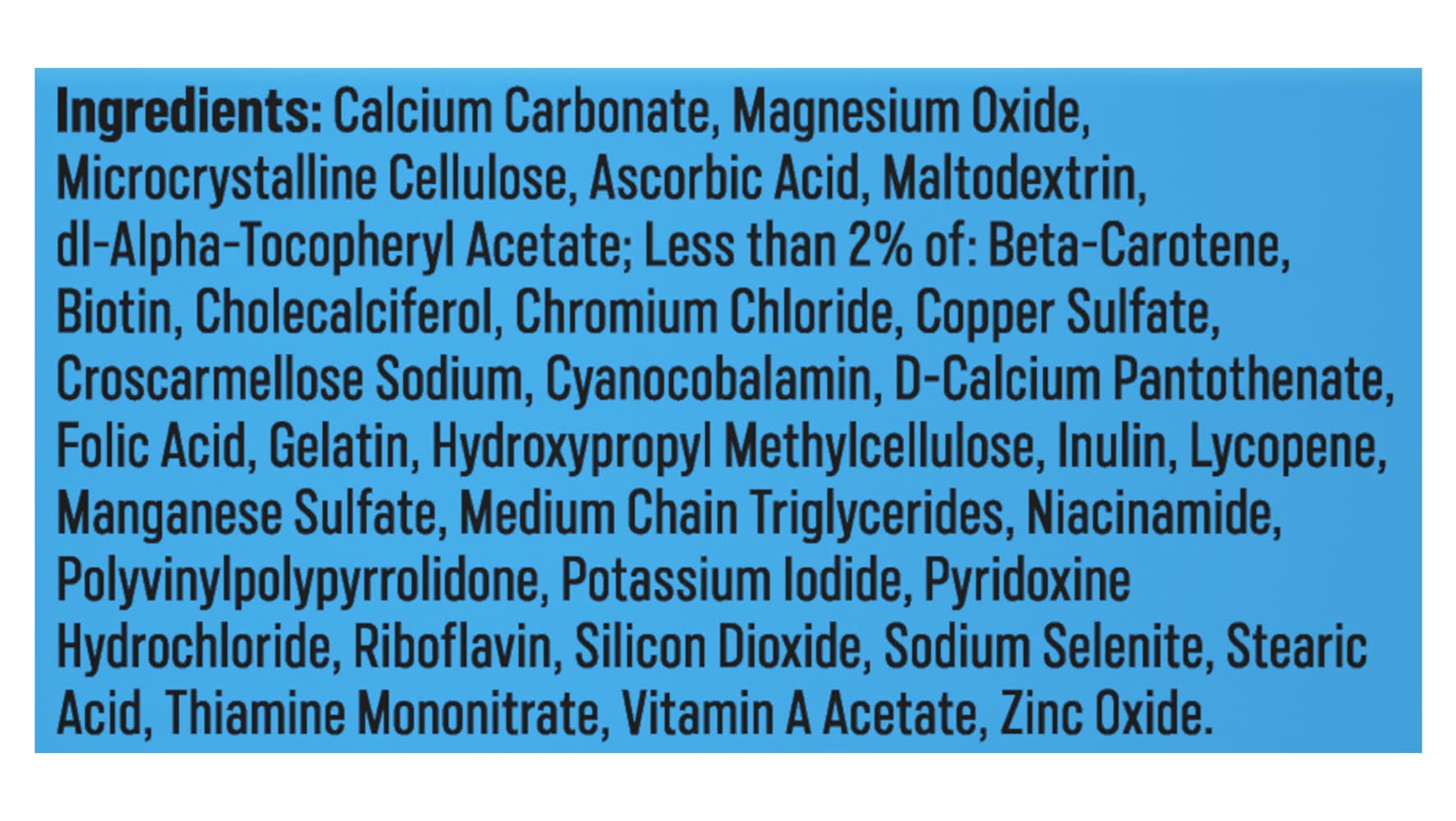 Ingredients: Calcium Carbonate, Magnesium Oxide, Microcrystalline Cellulose, Ascorbic Acid, Maltodextrin, DL-Alpha-Tocopheryl Acetate; Less than 2% of: Beta-Carotene, Biotin, Cholecalciferol, Chromium Chloride, Copper Sulfate, Croscarmellose Sodium, Cyanocobalamin, D-Calcium Pantothenate, Folic Acid, Gelatin, Hydroxypropyl Methylcellulose, Inulin, Lycopene, Manganese Sulfate, Medium Chain Triglycerides, Niacinamide, Polyvinylpolypyrrolidone, Potassium Iodide, Pyridoxine Hydrochloride, Riboflavin, Silicon Dioxide, Sodium Selenite, Stearic Acid, Thiamine Mononitrate, Vitamin A Acetate, Zinc Oxide