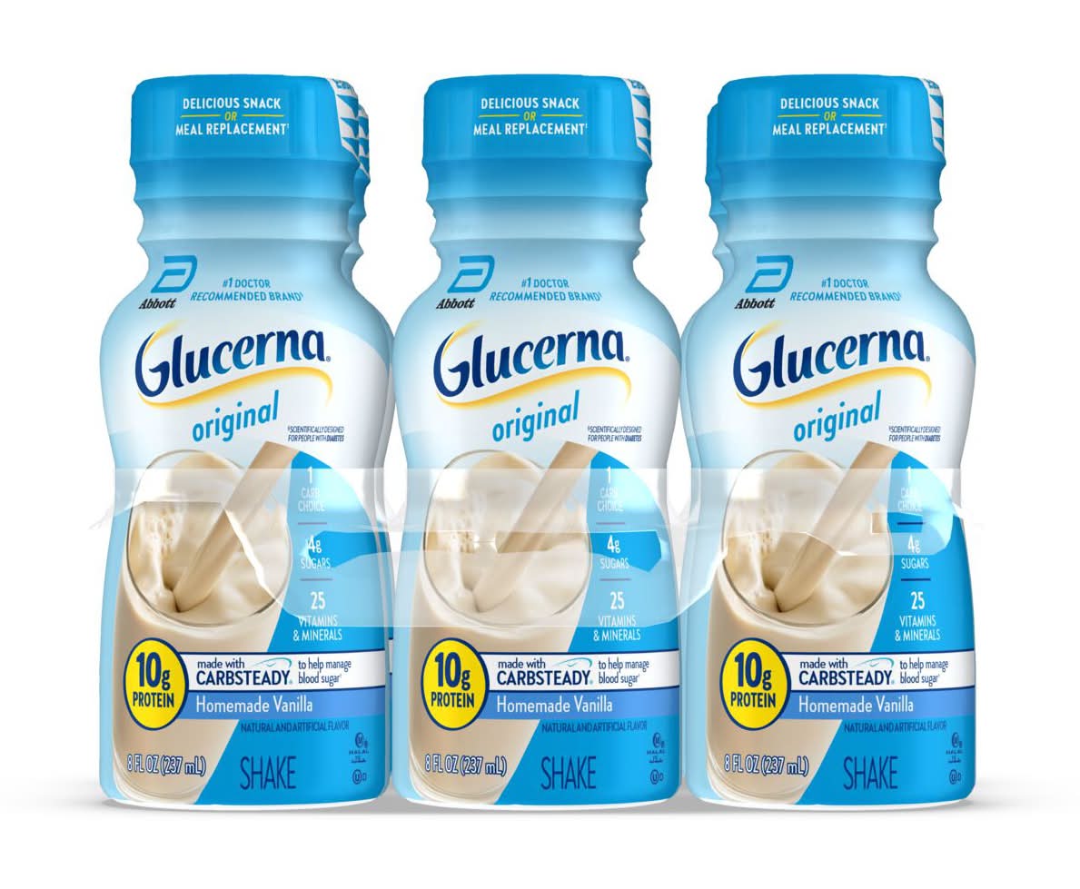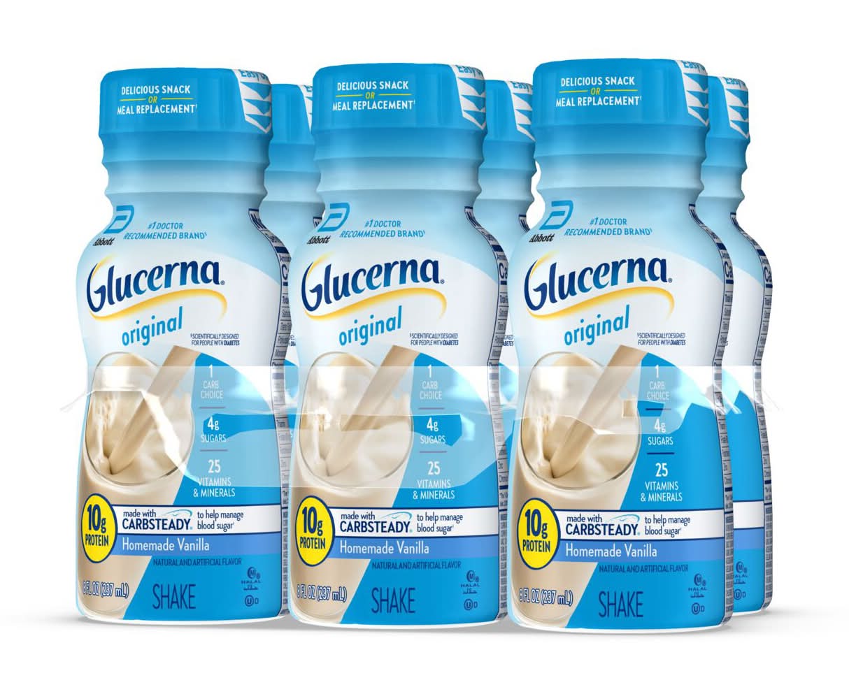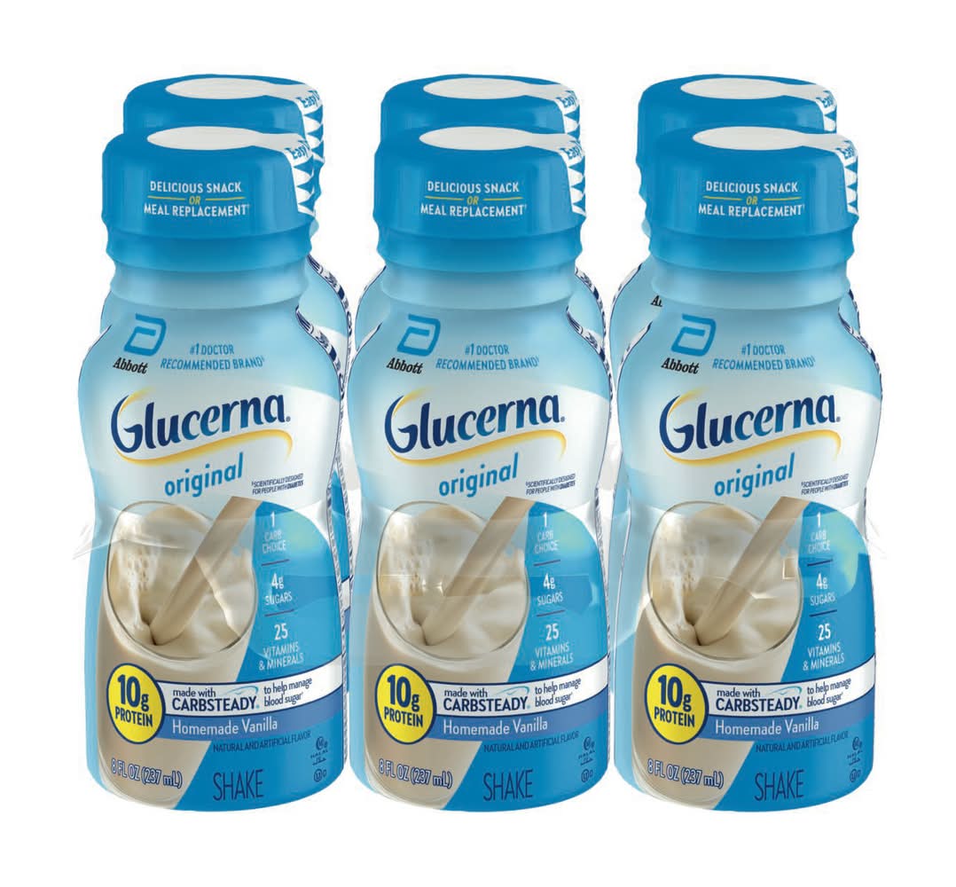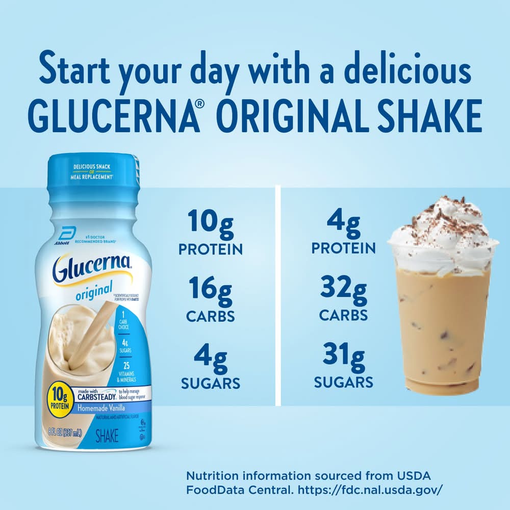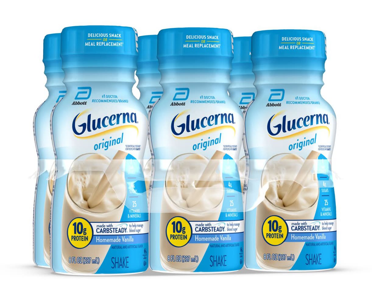 Glucerna Original Homemade Vanilla Shake offers a blend of nutrients tailored for individuals managing their blood sugar levels. Each shake contains CARBSTEADY, a unique combination of slow-release carbohydrates, alongside 10 grams of high-quality protein and essential vitamins and minerals such as vitamins A, C, D, E, zinc, and selenium. These shakes serve as convenient meal or snack replacements. They are formulated to be gluten-free and are also suitable for individuals with lactose intolerance, excluding those with galactosemia. • Flavor: Vanilla • Pack size: 6 • Abbott Nutrition, Columbus, OH.