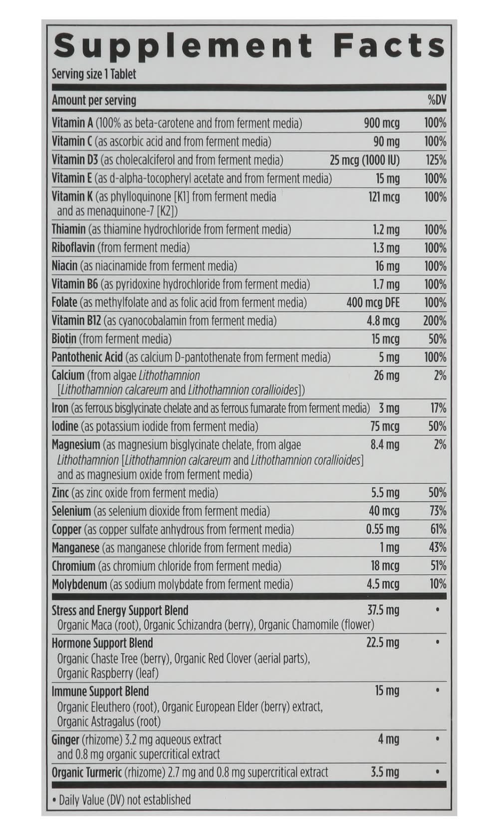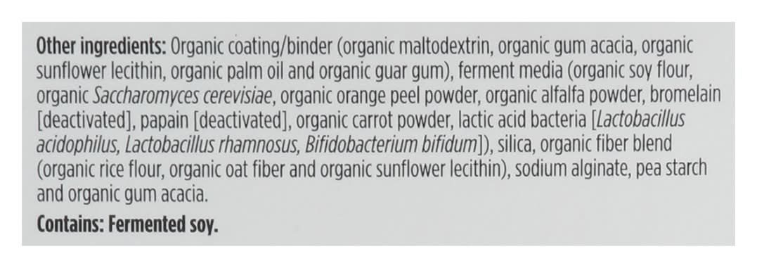 Ingredients: Stress and Energy Support Blend: Organic Maca (Root), Organic Schizandra (Berry), Organic Chamomile (Flower), Hormone Support Blend: Organic Chaste Tree (Berry), Organic Red Clover (Aerial Parts), Organic Astragalus (Root), Immune Support Blend: Organic Eleuthero (Root), Organic European Elder (Berry) Extract, Organic Astragalus (Root), Other Ingredients: Organic Coating/Binder (Organic Maltodextrin, Organic Gum Acacia, Organic Sunflower Lecithin, Organic Palm Oil and Organic Guar Gum), Ferment Media (Organic Soy Flour, Organic Saccharomyces Cerevisiae, Organic Orange Peel Powder, Organic Alfalfa Powder, Bromelain [Deactivated], Papain [Deactivated], Organic Carrot Powder, Lactic Acid Bacteria [Lactobacillus Acidophilus, Lactobacillus Rhamnosus, Bifidobacterium Bifidum), Silica, Organic Fiber Blend (Organic Rice Flour, Organic Oat Fiber and Organic Sunflower Lecithin), Sodium Alginate, Pea Starch and Organic Gum Acacia Contains: Soybeans