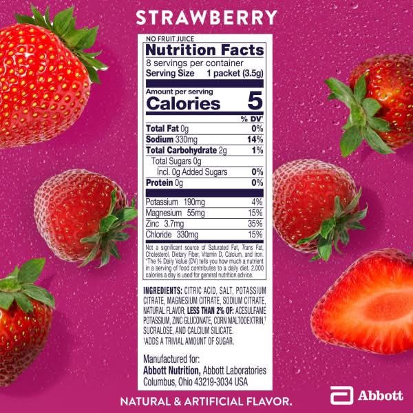 Pedialyte Electrolyte Drink Mix is hydration that has 3 key electrolytes: sodium, chloride, and potassium. Designed for adults, it has zinc and magnesium for immune support and zero sugar.* Our refreshing electrolyte drink mix comes in 3 great flavors: Berry Frost, Passion Fruit, and Strawberry. It is gluten-free and has no artificial colors. Pedialyte Electrolyte Drink Mix is not for children under 5 years of age for mild to moderate dehydration due to vomiting and diarrhea. * Low in calories. Color: Strawberry