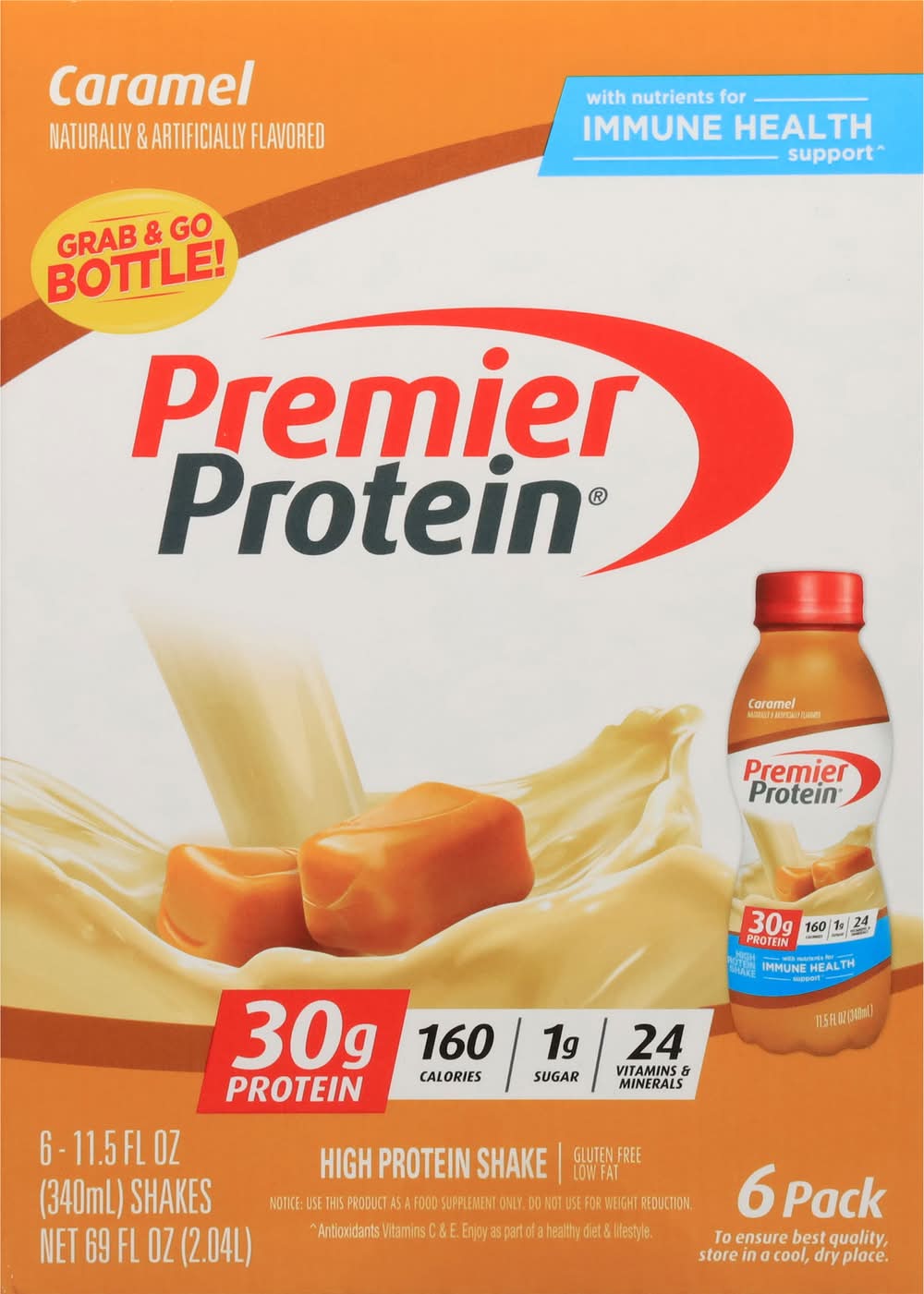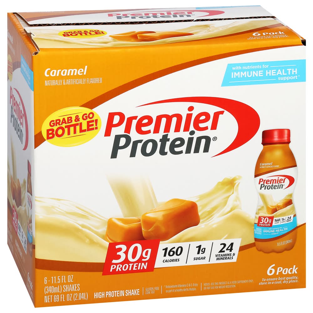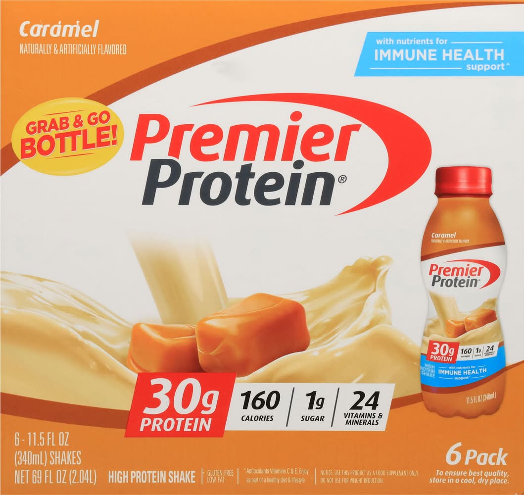 packaged in a recyclable bottle, each premier protein shake contains 30 grams of protein, complete with all of the essential amino acids, 1g of sugar, 5g carbs, 160 calories, 24 vitamins & minerals, and is also low in fat. we use a proprietary blend of milk protein, casein and whey protein in our shakes to help fuel muscles quickly and for several hours to help support your goals. enjoy a shake as a meal replacement or as a healthy satisfying snack. they are perfect for breakfast on-the-go, an afternoon snack, or as pre- or post-workout fuel. they are delicious as is, but are also highly customizable. try blending with your favorite fruits and vegetables for a delicious smoothie or adding to cereal or oatmeal. available in 11 delicious smooth and creamy flavors: café latte, chocolate, vanilla, caramel, cookies & cream, bananas & cream, peaches & cream, strawberries & cream, chocolate peanut butter, cinnamon roll, cake batter delight. • Flavor: Caramel • Pack size: 6 • Packaging: Reusable