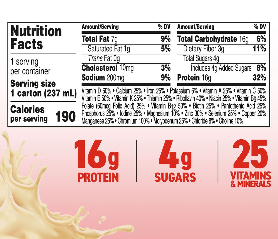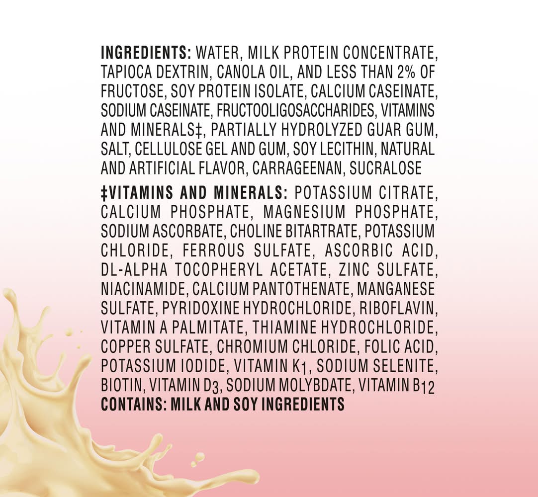 Ingredients: WATER, MILK PROTEIN CONCENTRATE, TAPIOCA DEXTRIN, CANOLA OIL, AND LESS THAN 2% OF FRUCTOSE, SOY PROTEIN ISOLATE, CALCIUM CASEINATE, SODIUM CASEINATE, FRUCTOOLIGOSACCHARIDES, VITAMINS AND MINERALS*, PARTIALLY HYDROLYZED GUAR GUM, SALT, CELLULOSE GEL AND GUM, SOY LECITHIN, NATURAL AND ARTIFICIAL FLAVOR, CARRAGEENAN, SUCRALOSE *VITAMINS AND MINERALS: POTASSIUM CITRATE, CALCIUM PHOSPHATE, MAGNESIUM PHOSPHATE, SODIUM ASCORBATE, CHOLINE BITARTRATE, POTASSIUM CHLORIDE, FERROUS SULFATE, ASCORBIC ACID, DL-ALPHA TOCOPHERYL ACETATE, ZINC SULFATE, NIACINAMIDE, CALCIUM PANTOTHENATE, MANGANESE SULFATE, PYRIDOXINE HYDROCHLORIDE, RIBOFLAVIN, VITAMIN A PALMITATE, THIAMINE HYDROCHLORIDE, COPPER SULFATE, CHROMIUM CHLORIDE, FOLIC ACID, POTASSIUM IODIDE, VITAMIN K1, SODIUM SELENITE, BIOTIN, VITAMIN D3, SODIUM MOLYBDATE, VITAMIN B12 Contains: CONTAINS: MILK AND SOY INGREDIENTS