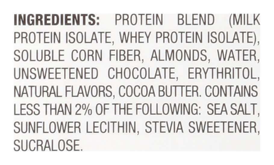 Ingredients: Protein Blend (Milk Protein Isolate, Whey Protein Isolate), Soluble Corn Fiber, Almonds, Water, Unsweetened Chocolate, Erythritol, Natural Flavors, Cocoa Butter, Contains Less than 2% of the Following: Sea Salt, Sunflower Lecithin, Stevia Sweetener, Sucralose Contains: Milk, Tree Nuts, Almonds, Corn, Eggs, Peanuts, Soybeans, Wheat, Tree Nuts
