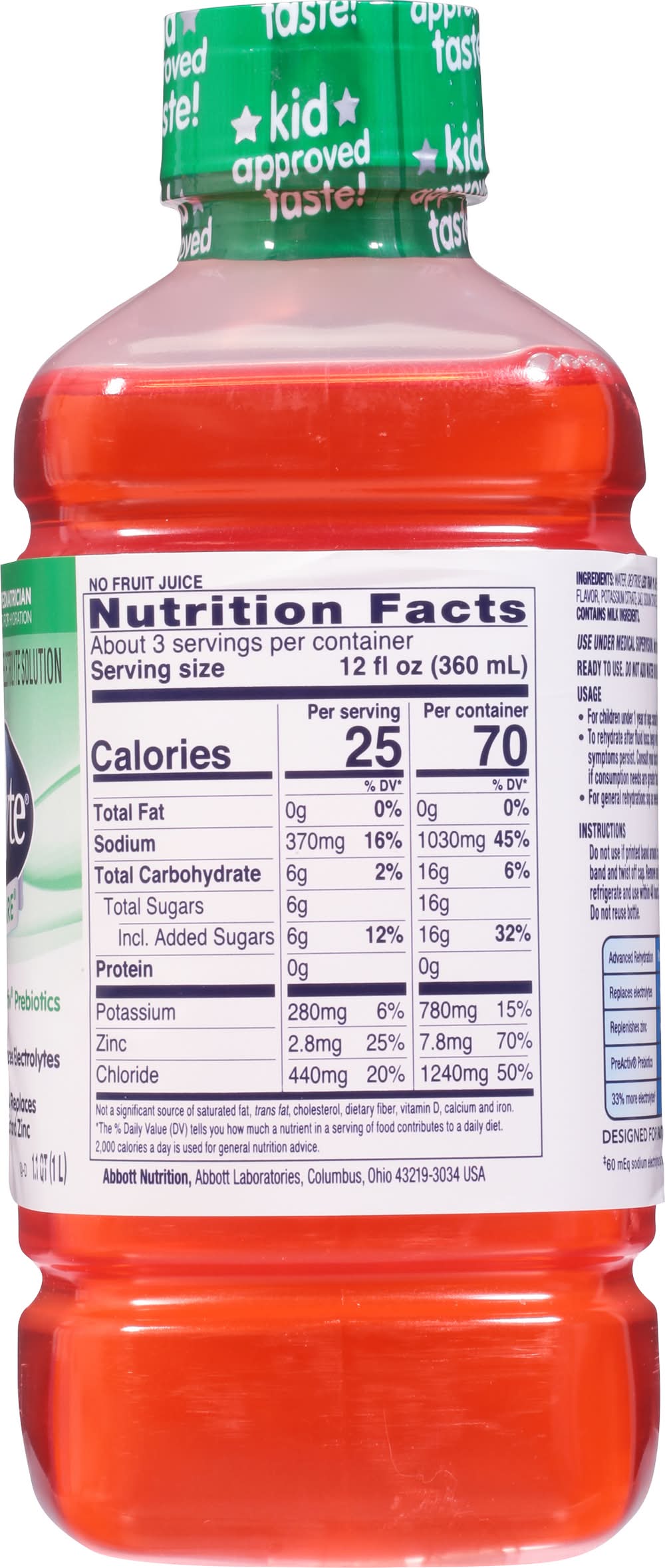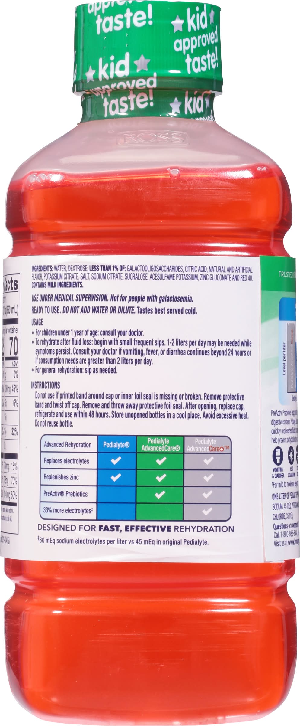 Directions for use: Ready to use. Do not add water or dilute. Usage: For children under 1 year of age: consult your doctor. To rehydrate after fluid loss: begin with small frequent sips. 1-2 liters per day may be needed while symptoms persist. Consult your doctor if vomiting, fever, or diarrhea continues beyond 24 hours or if consumption needs are greater than 2 liters per day. For general rehydration: sip as needed. Instructions: Do not use if printed band around cap or inner foil seal is missing or broken. Remove protective band and twist off cap. Remove and throw away protective foil seal. After opening, replace cap, refrigerate and use within 48 hours. Store unopened bottles in a cool place. Avoid excessive heat. Do not reuse bottle. Tastes best served cold. Storage recommendation: After opening, replace cap, refrigerate and use within 48 hours. Store unopened bottles in a cool place. Avoid excessive heat.