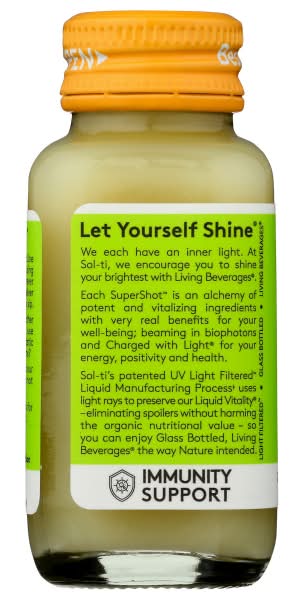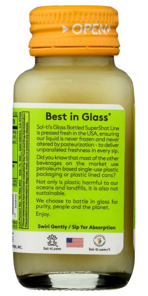 This powerful shot is an upgrade on the original ginger shot, packed with 17 grams of Freshly Pressed Organic Ginger! This pungent SuperShot has a warm, but delicious bite from the combination of ginger, lemon, and green apple to give you that natural energy boost, circulation support, and immunity boost that tastes incredible, too. • Sol-Ti, 8380 Miralani Dr., San Diego, CA, 92126 • Packaging: Reusable